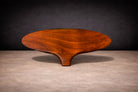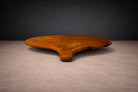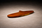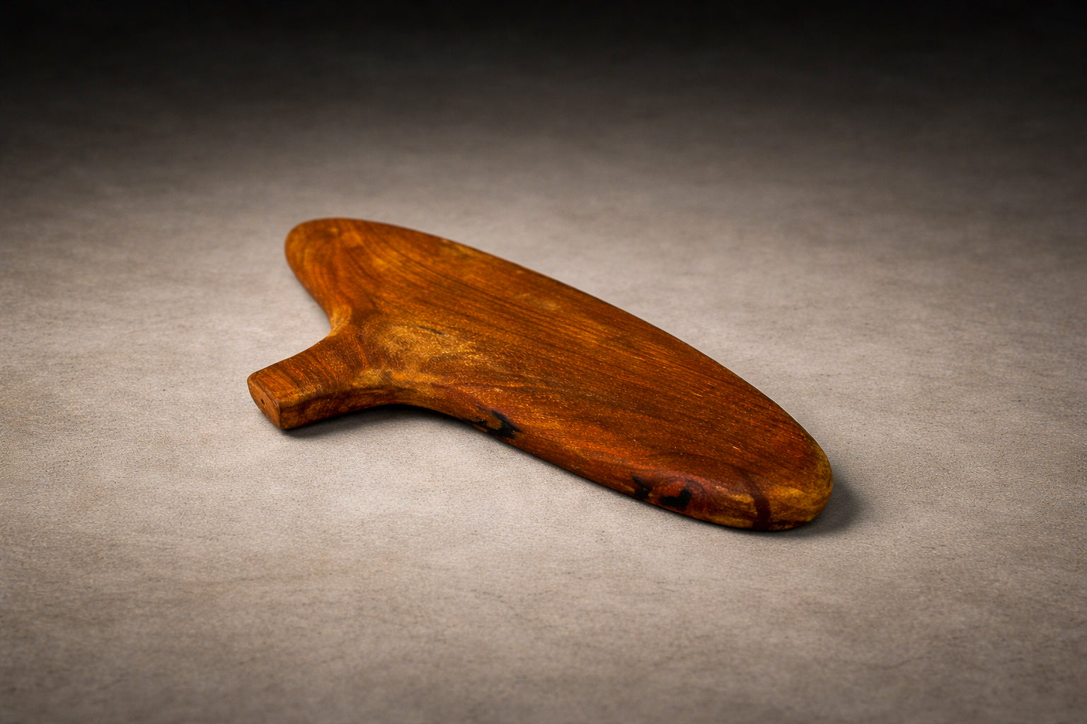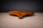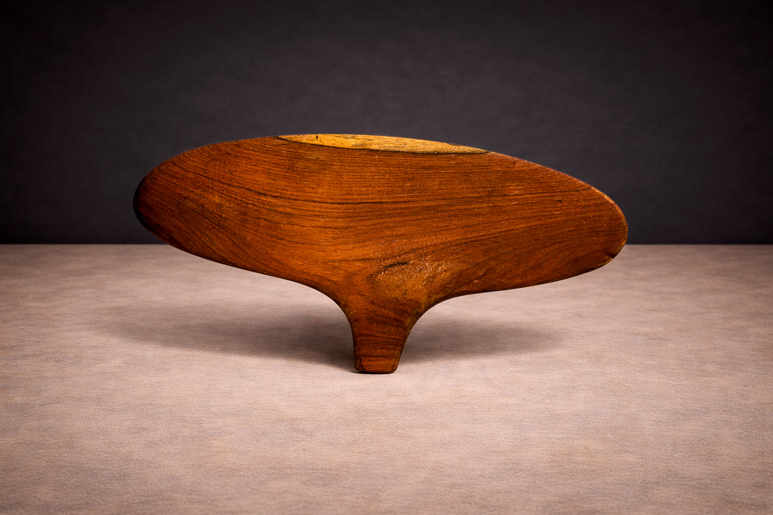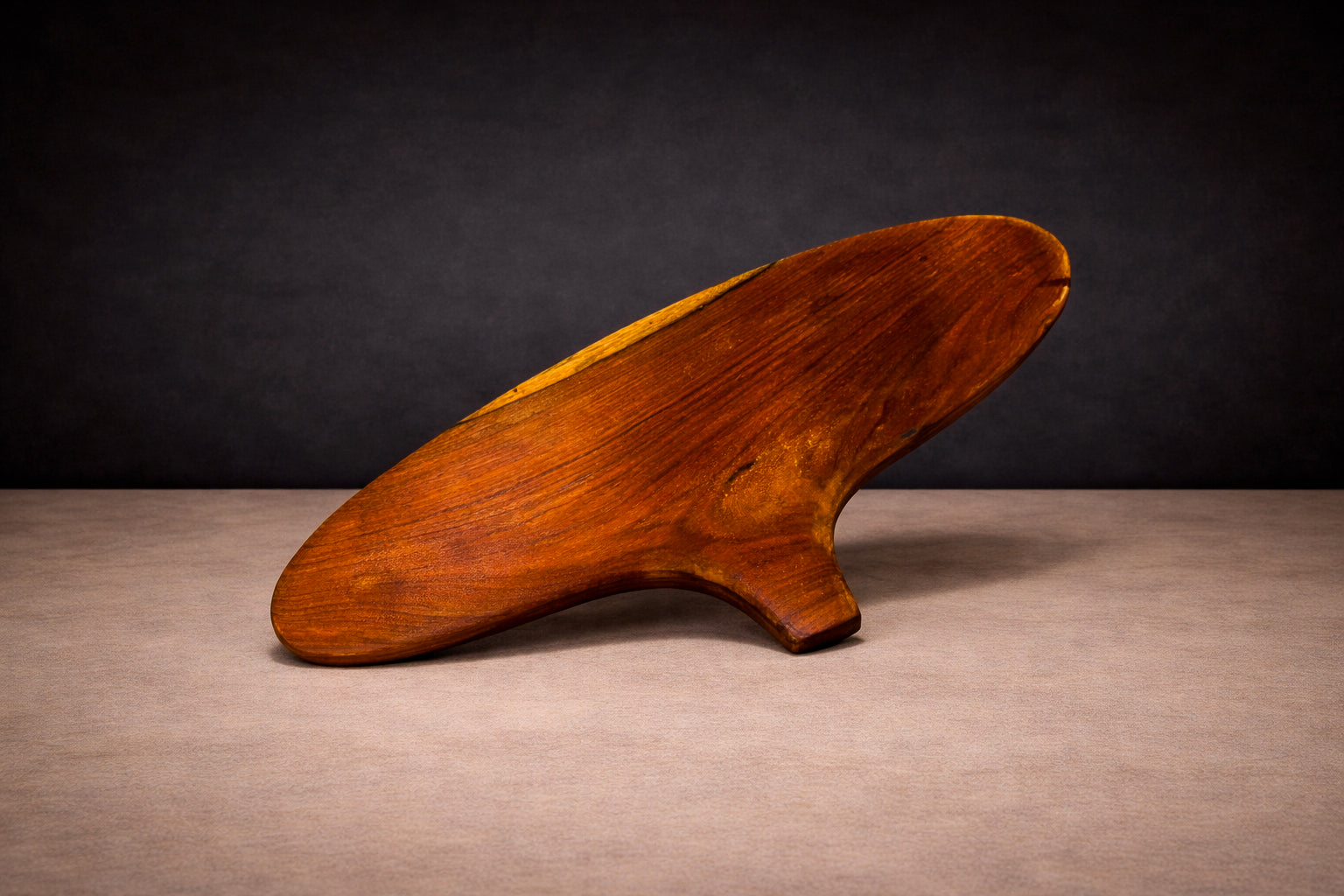 Its elongated, organic silhouette tapers gently to a raised support, introducing a subtle sculptural lift that distinguishes it from conventional flat boards. The carved profile emphasizes structural clarity while preserving the integrity of the wood, allowing the surface to function equally as presentation piece and utilitarian object.
