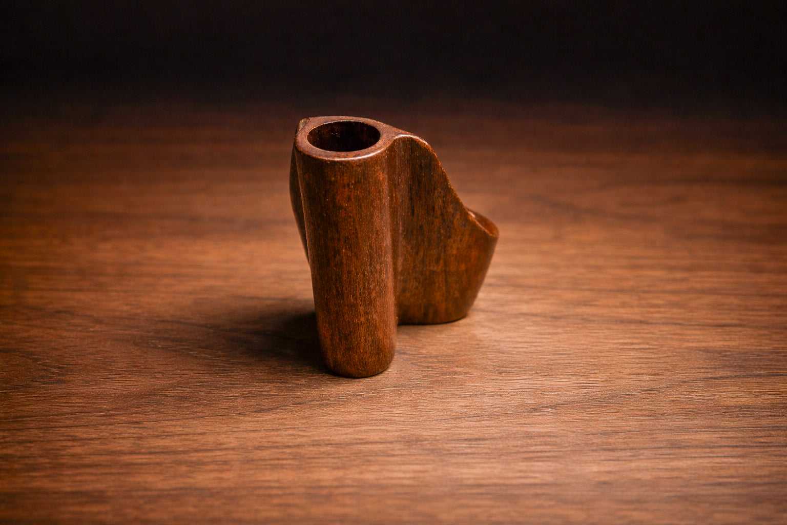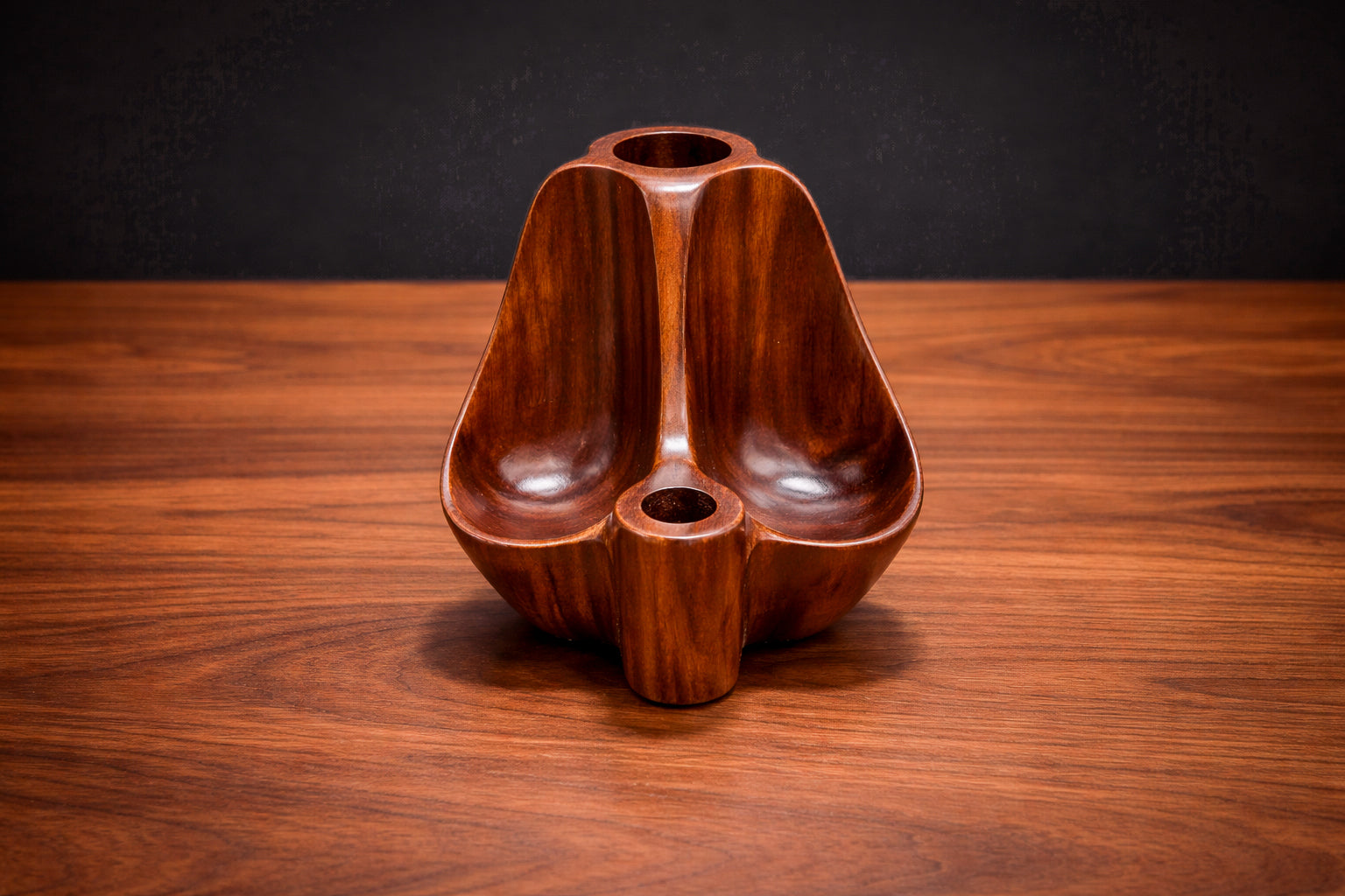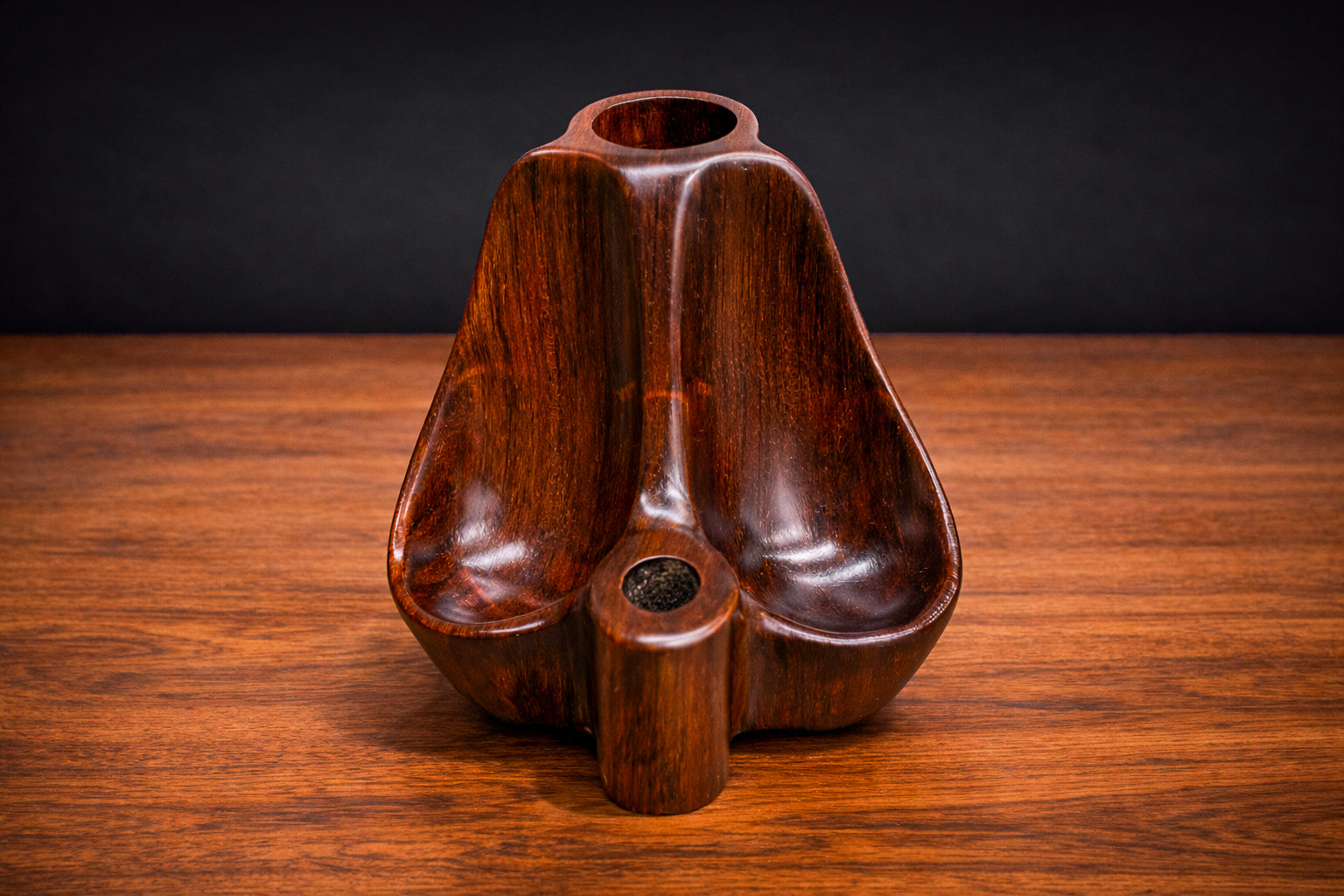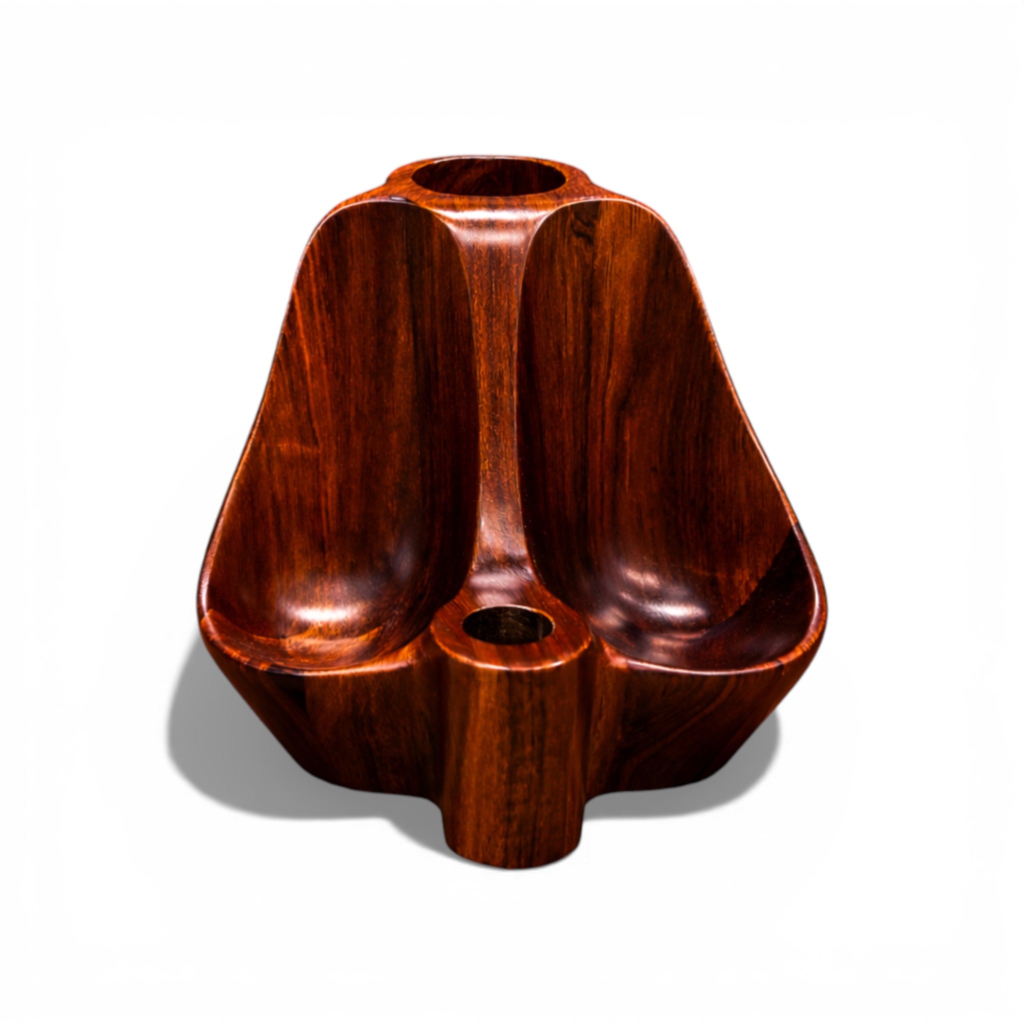 Carved from solid jacarandá (Brazilian rosewood), the composition is organized around three concave compartments unified by a central vertical spine. The gently flared silhouette and rounded recesses articulate a controlled interplay of mass and void, while the cylindrical pipe rests are integrated seamlessly into the lower and upper sections. The form reads as a continuous carving rather than an assembly, reinforcing its structural coherence.
