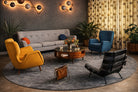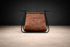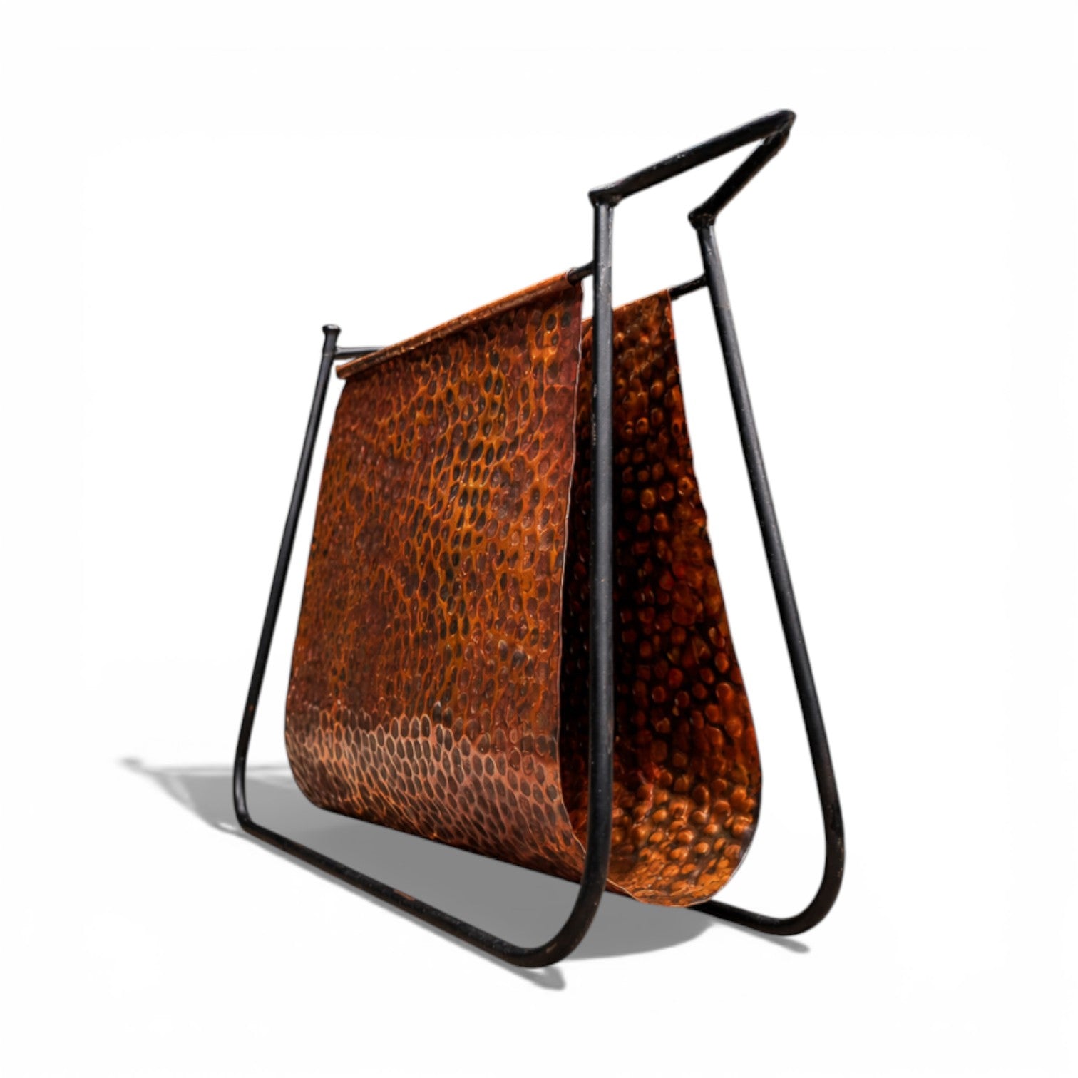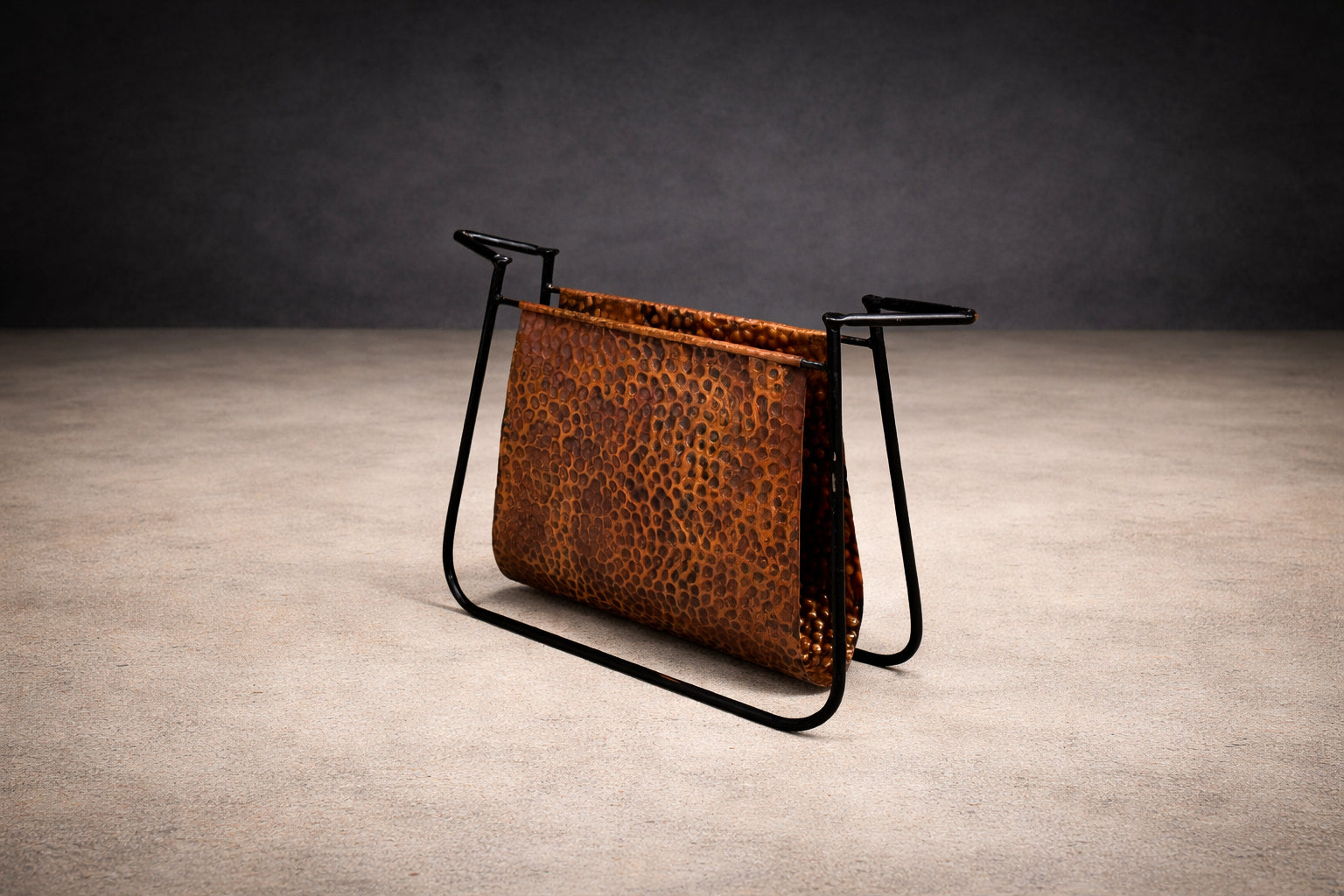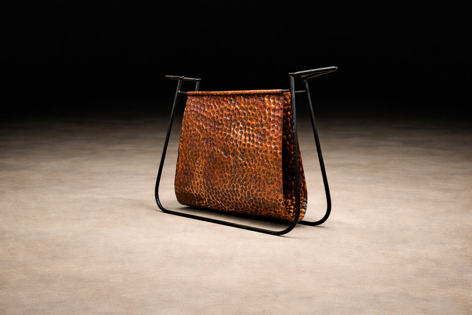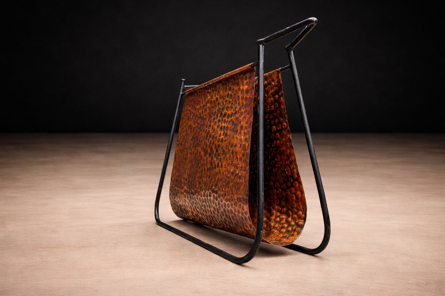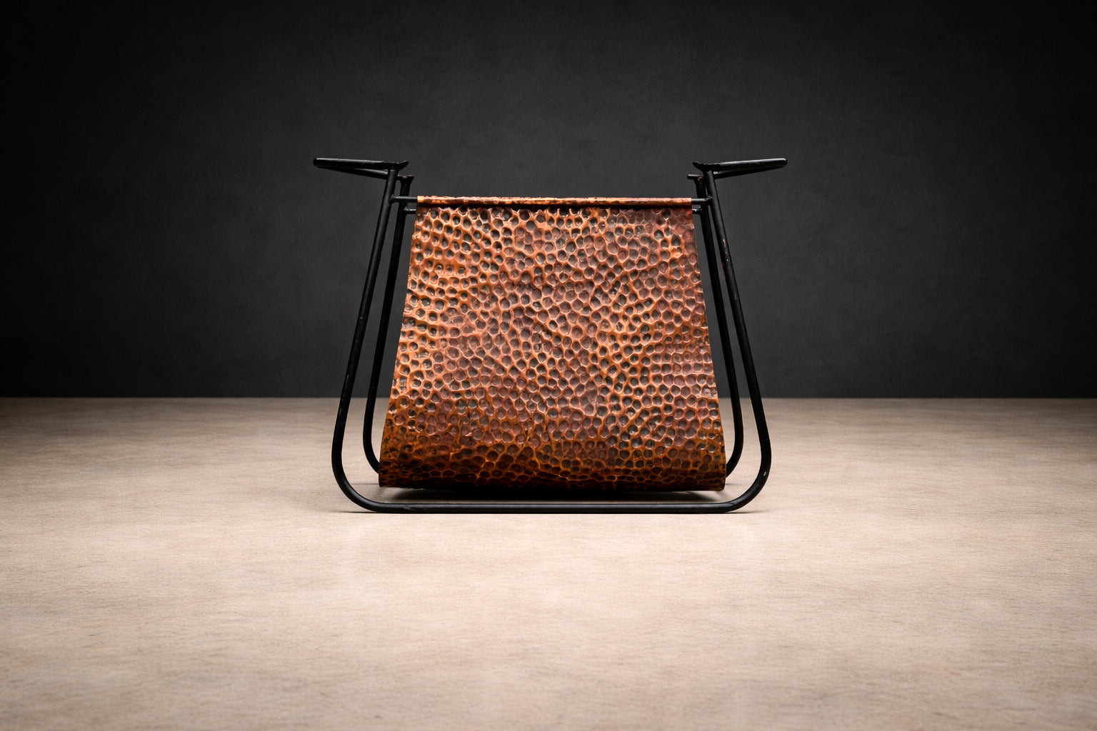 The copper’s hand-worked surface introduces depth and movement, catching light with subtle tonal variation, while the linear iron structure grounds the composition with architectural clarity. Both functional and decorative, the design holds periodicals, books, or folios with effortless elegance, making it equally suited to residential interiors or executive settings.