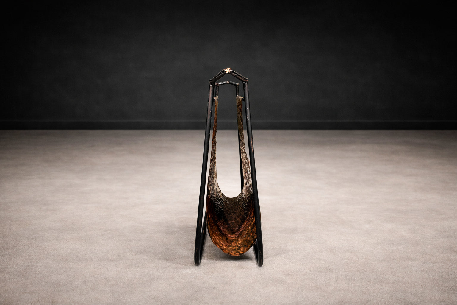 A sculptural exercise in material contrast, this magazine rack designed by Carlo Hauner and Martin Eisler for Forma in the 1950s captures the experimental spirit of early Brazilian Modernism. A hammered copper sling — richly patinated and texturally dimpled — is suspended within a minimalist black painted metal frame, creating a refined dialogue between warmth and restraint.