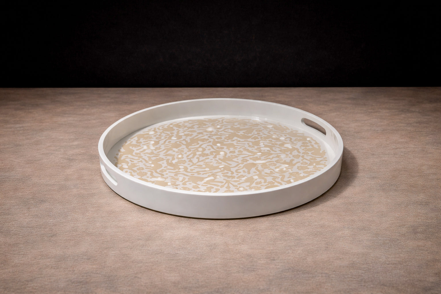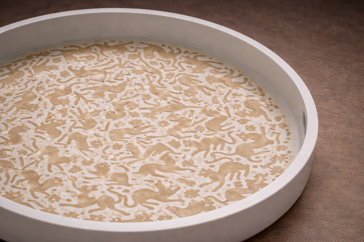 Executed in the historic maque lacquer tradition of Olinalá, Guerrero, this circular tray reflects a lineage of Mexican decorative arts distinguished by discipline, patience, and material knowledge. Its restrained white perimeter frames a hand-painted beige composition, where fluid, organic motifs unfold across the surface in a controlled yet expressive pattern.