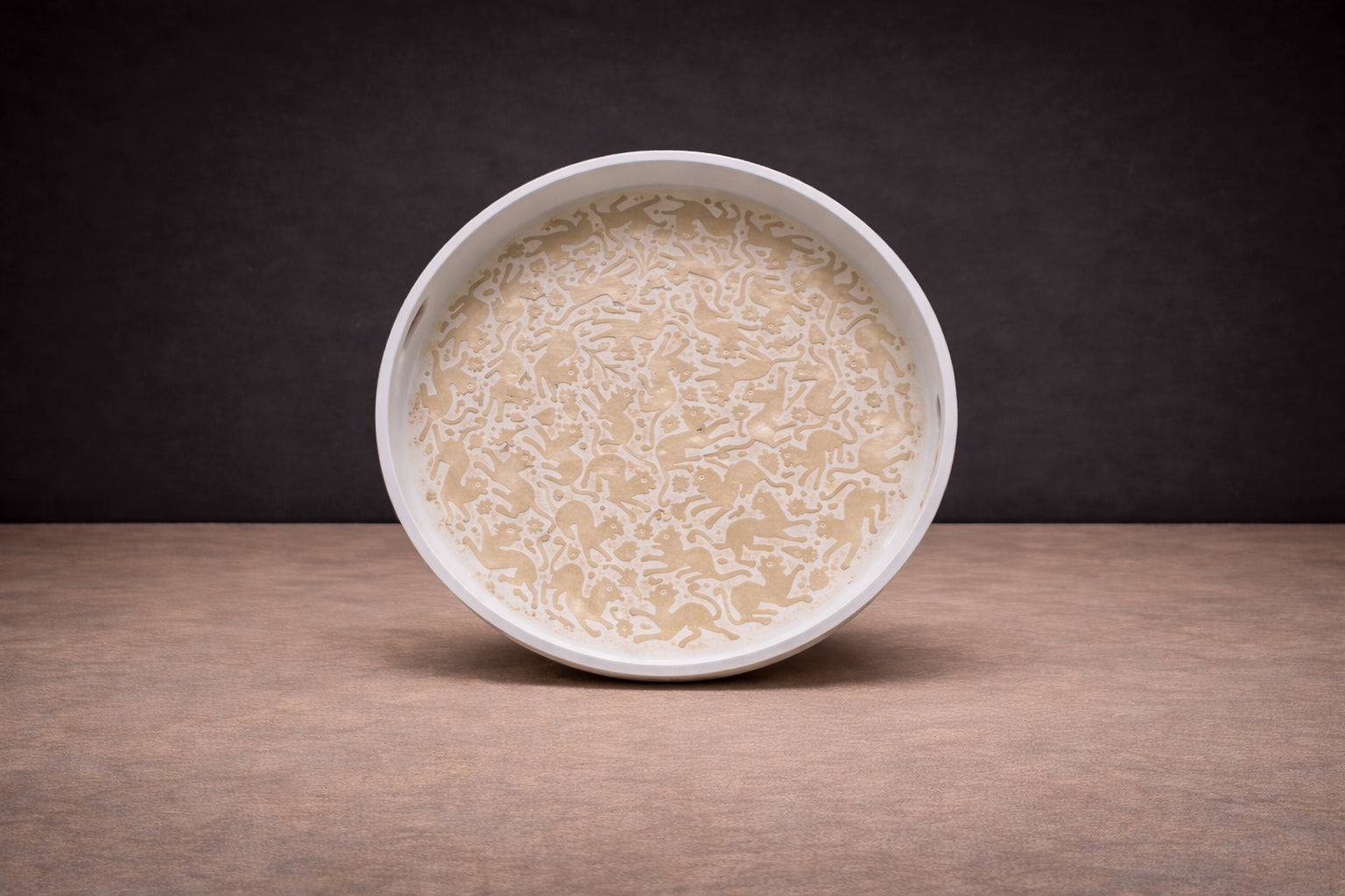 The form is defined by a shallow cylindrical wall with integrated cutout handles, reinforcing both structural clarity and usability. The circular geometry provides a measured boundary for the painted field, allowing the natural pigments to articulate subtle tonal variation without overwhelming the object’s formal balance. Ornament and structure remain in dialogue—neither subordinate to the other.