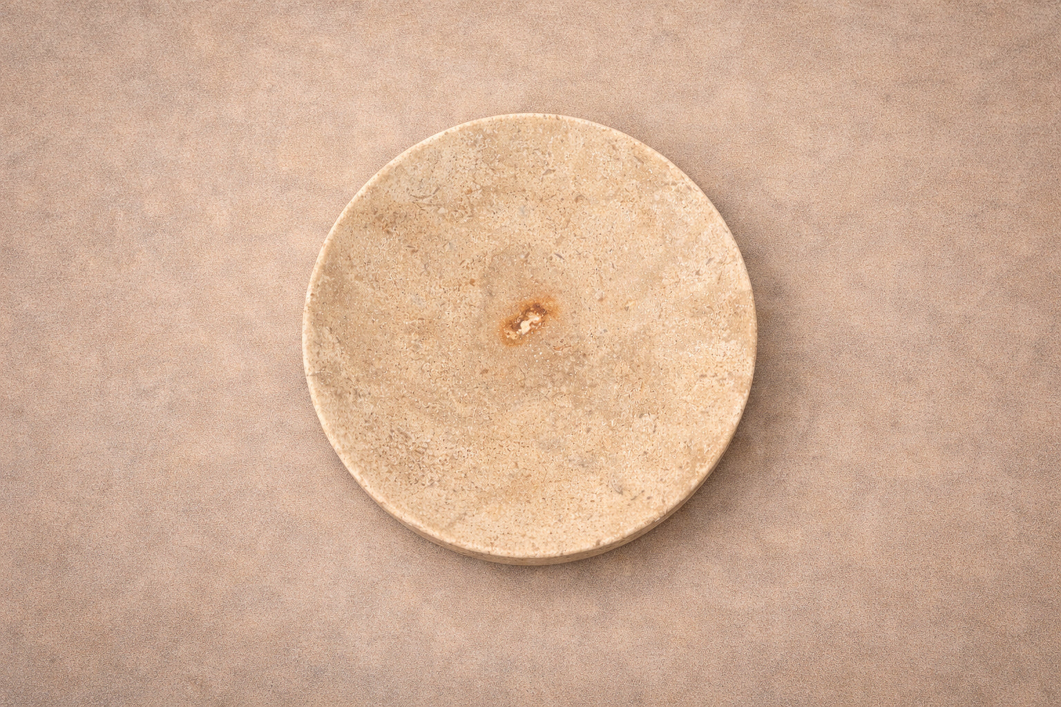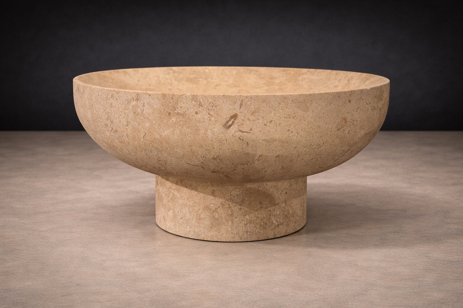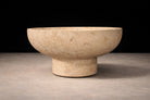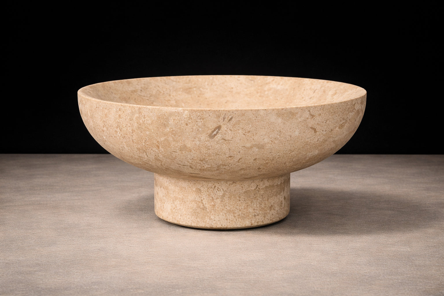 The form is composed of a broad, shallow bowl resting on a cylindrical pedestal base, creating a balanced silhouette anchored by weight and geometry. Subtle fossil inclusions and tonal variations remain visible across the surface, underscoring the integrity of the travertine and the hand-finishing process. The softly honed texture preserves the stone’s tactile quality while maintaining structural precision along the rim and base.