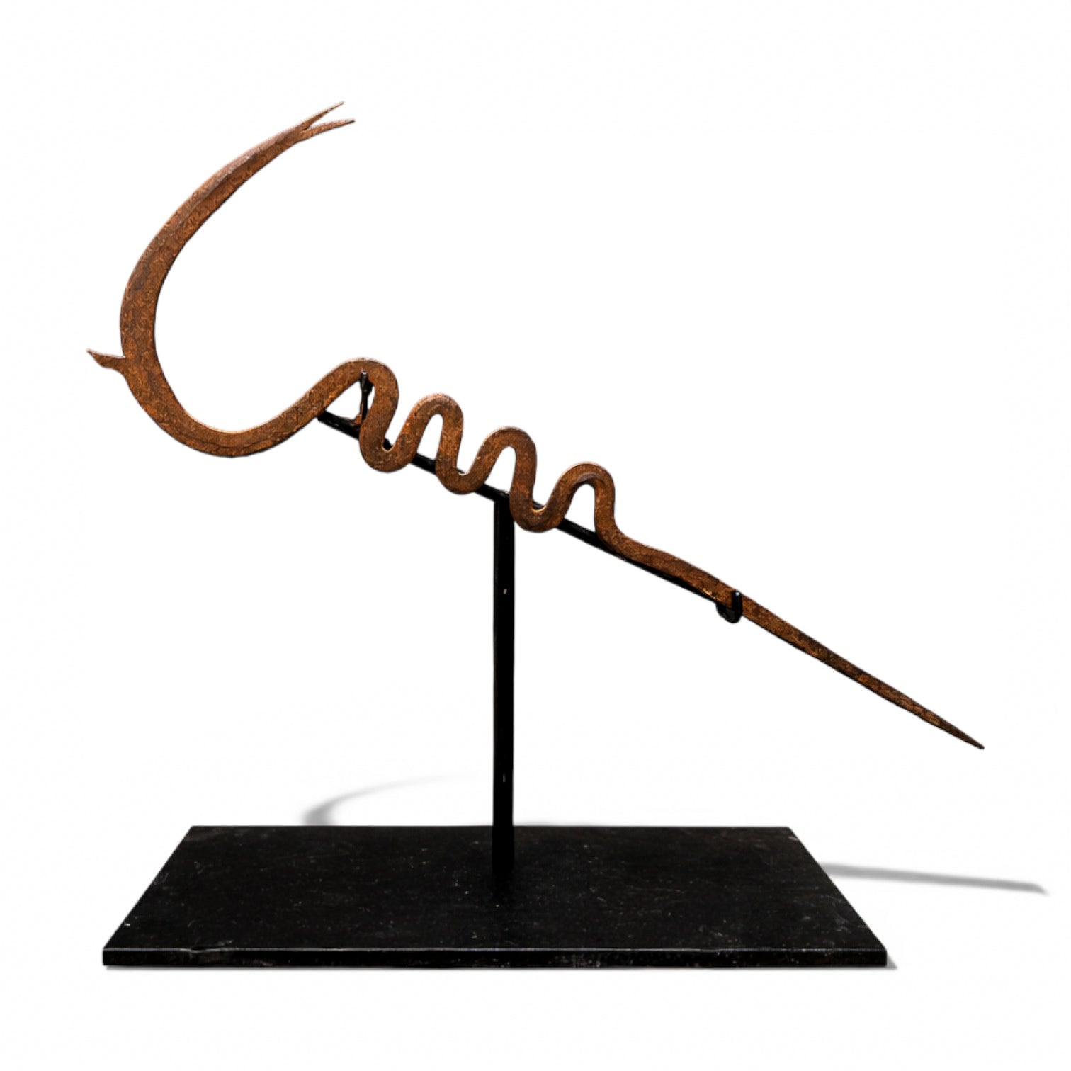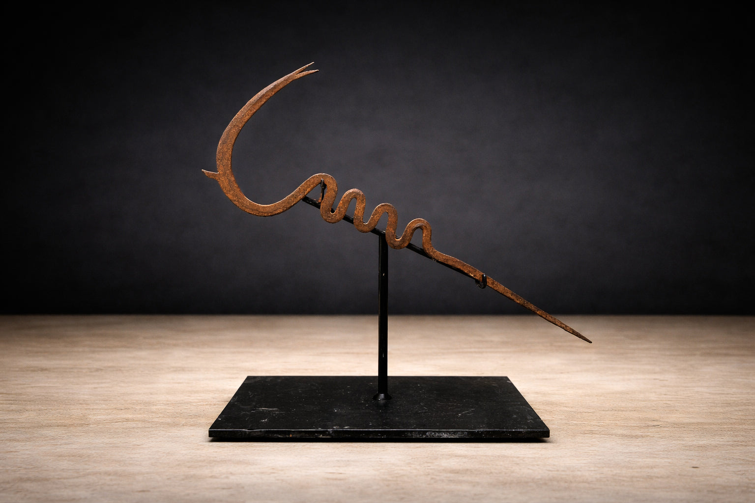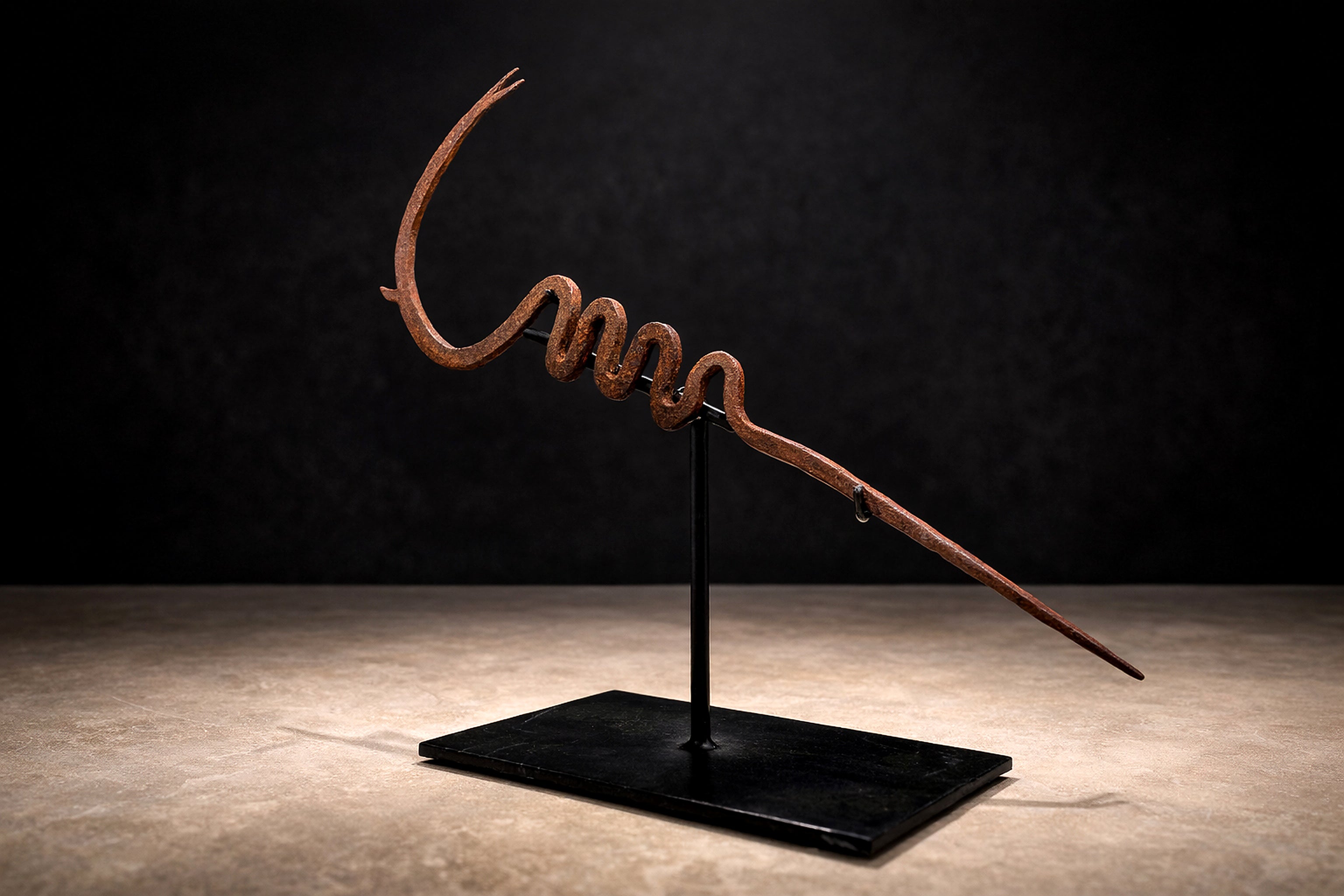 Mounted on a custom black steel base for presentation, the currency reads today as a striking abstract sculpture—minimal, rhythmic, and deeply expressive. Its asymmetry and coiled geometry anticipate modernist abstraction, yet remain grounded in cultural function and ritual economy.
