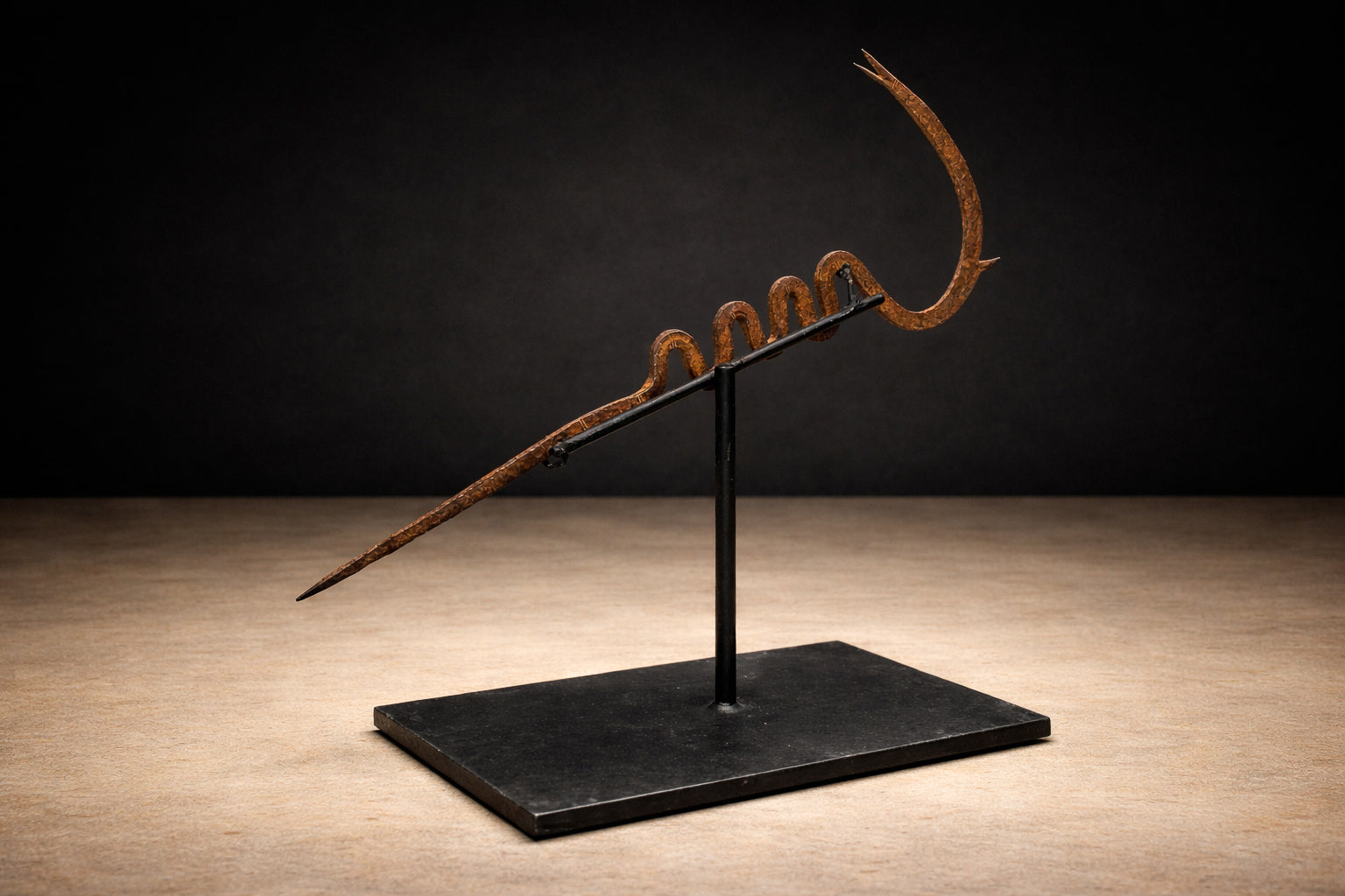 This exceptional Kirdi iron currency from West and Central Cameroon exemplifies that convergence of metallurgy and meaning. Hand-forged in iron, its composition is both architectonic and gestural: a crescent blade arcs upward with tensile energy, counterbalanced by a rhythmic serpentine coil that undulates along the shaft before resolving into a tapered spike.