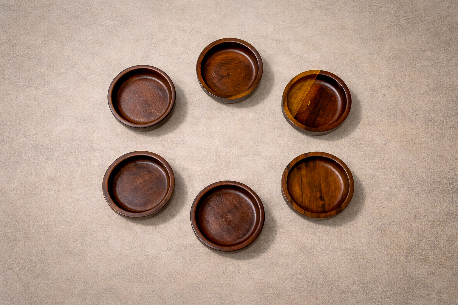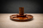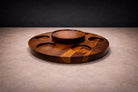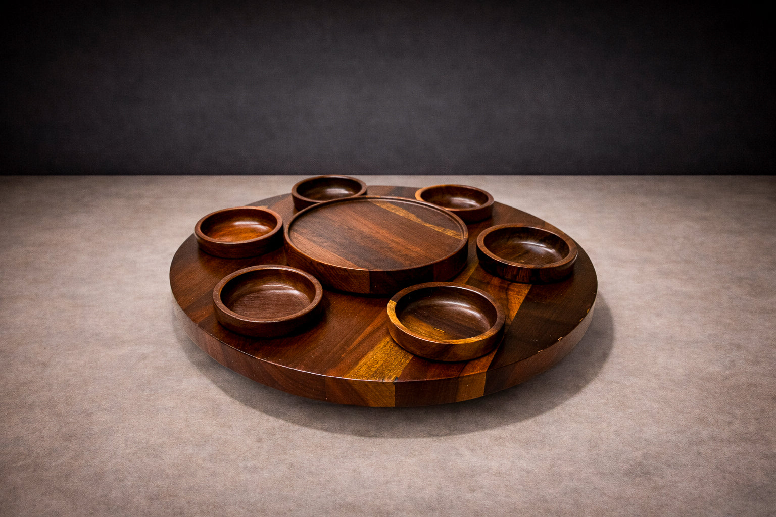 The composition is organized around a substantial spinning center piece that holds the bowls, articulated in richly grained Brazilian rosewood. Six removable bowls are precisely fitted around a central serving dish, creating a balanced radial geometry that is both intuitive and visually cohesive. The circular arrangement reinforces a sense of order and symmetry, while the weight and proportion of each element lend the piece a grounded presence on the table.