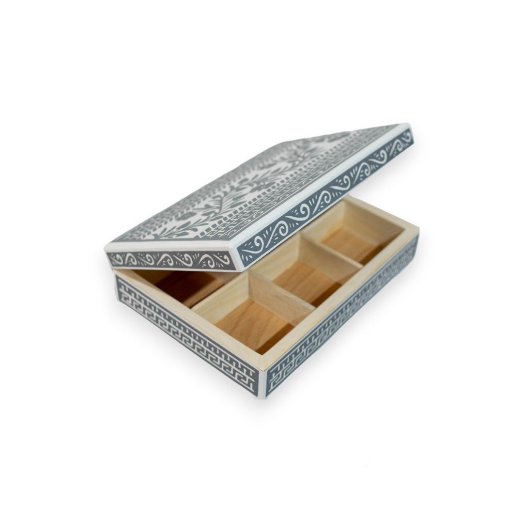 This exquisite wooden box, crafted by the talented artisans of Ensamble Artesano, is a celebration of the rich cultural artistry of Mexico. Hand-painted with natural pigments, its intricate patterns are a testament to the artisans' skill and dedication to preserving traditional techniques. The box's divided interior make it not only a beautiful piece of art but also a practical storage space.