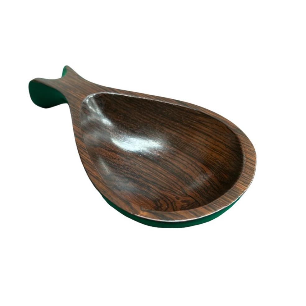 This mid-century modern decorative spoon is handcrafted with Brazilian rosewood (also known as jacaranda) and features clean lines with elegant curves. The wood has a deep, dark, and rich tone with a stunning natural wood grain. In addition, it has also been refinished and is now in excellent condition. A beautiful piece like this will look amazing in any styled home interior.