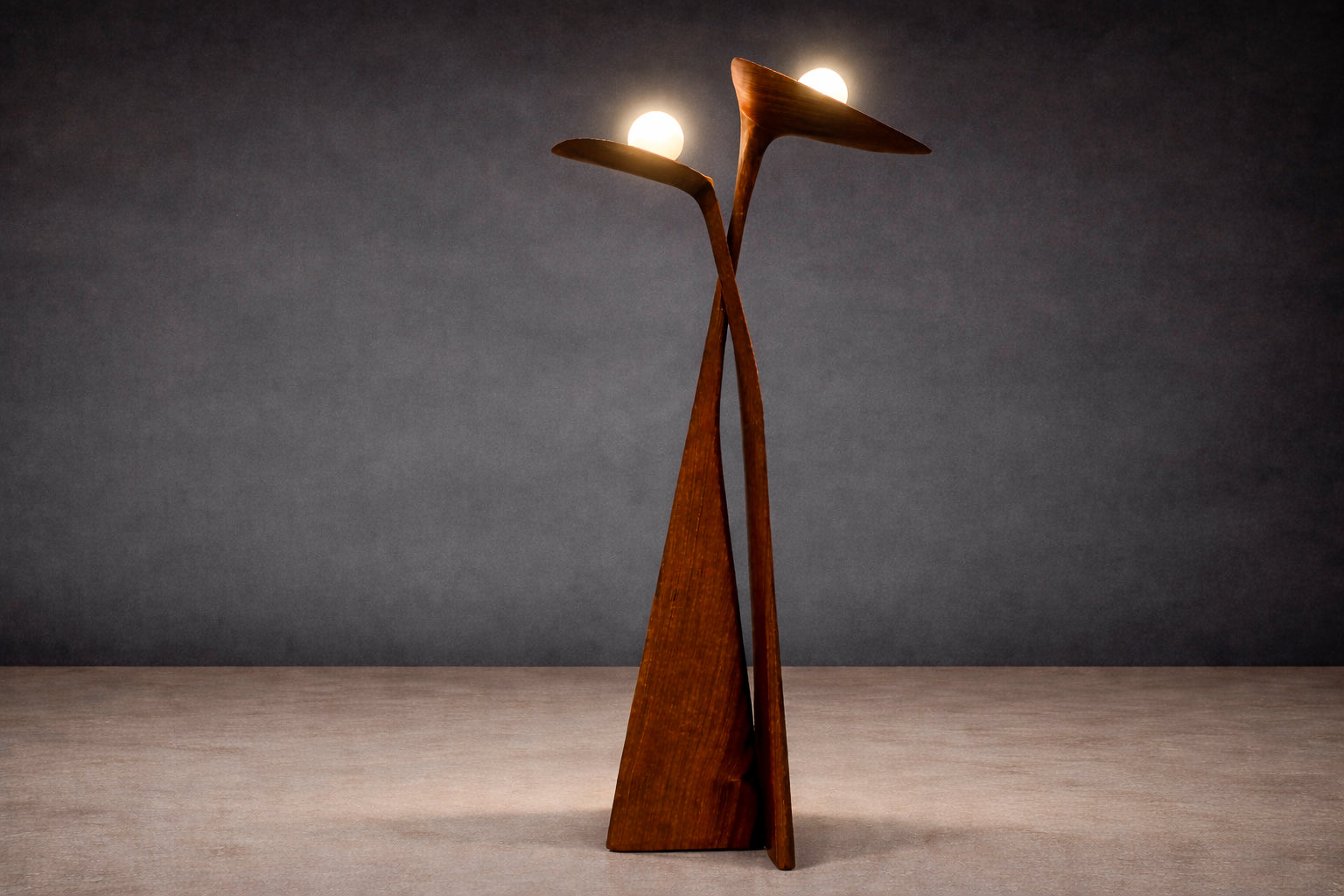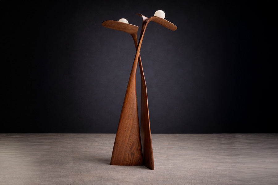 The design is defined by an abstract, biomorphic composition that suggests two interdependent bodies held in quiet balance. Rather than literal representation, the form distills the idea of union into a sculptural language articulated through proportion, rhythm, and mutual reliance. The relationship between the paired elements establishes cohesion and visual tension, allowing the lamp to read as both symbolic and structurally resolved.