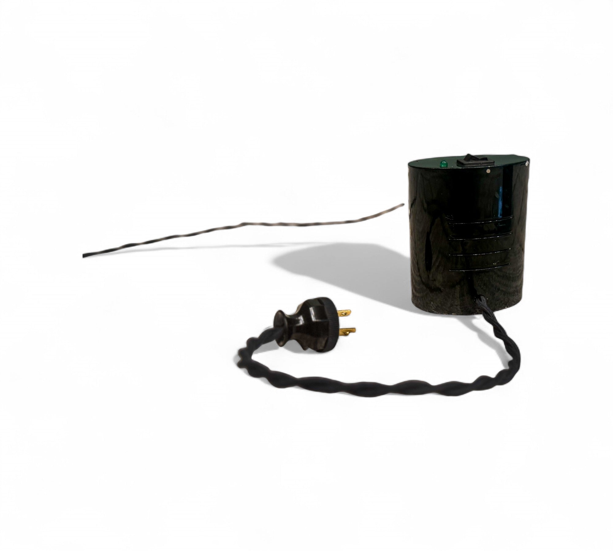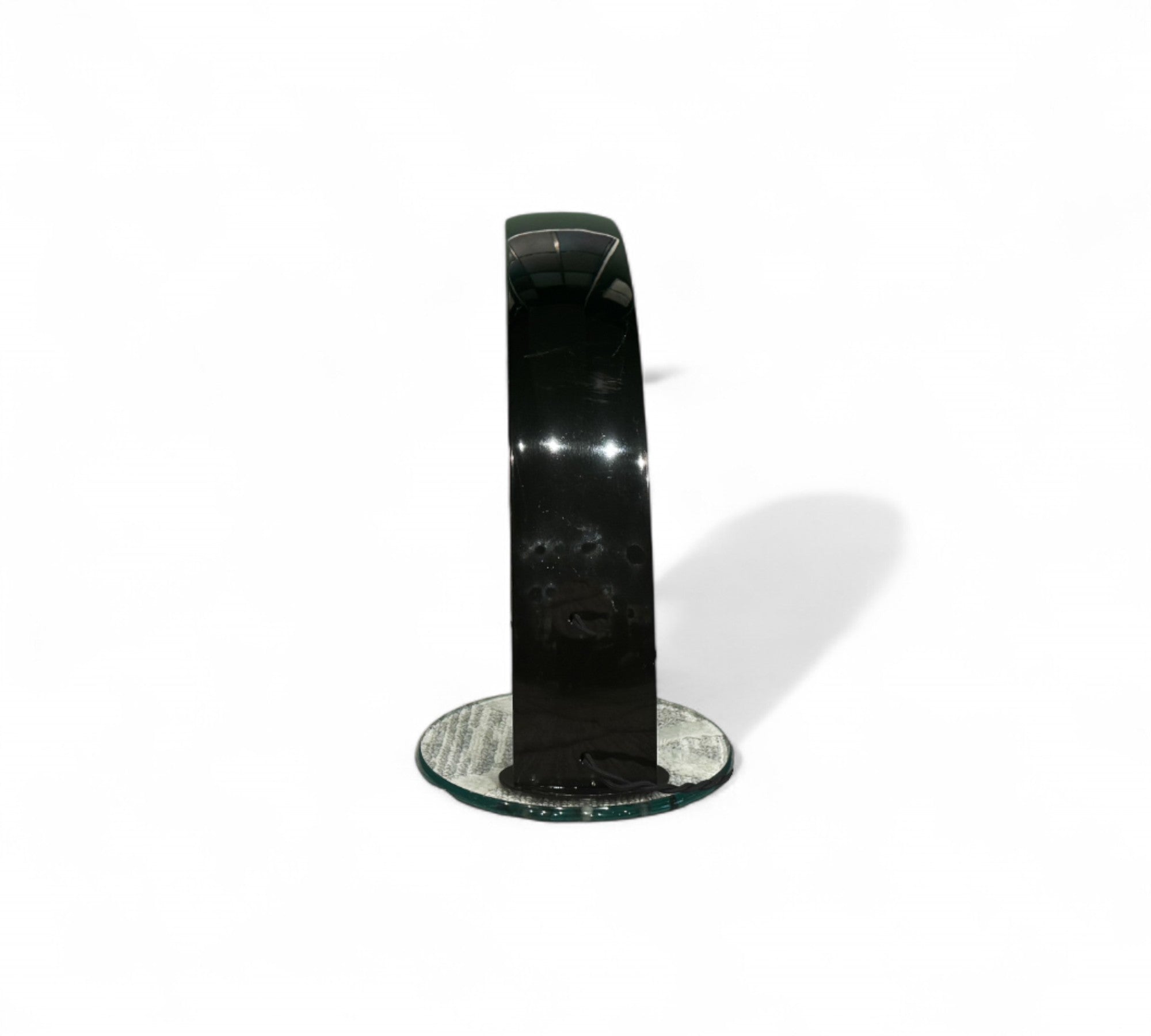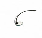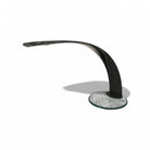 This modern desk lamp showcases a refined minimalist aesthetic, highlighted by its elegantly curved silhouette and glossy black finish. The lamp features a gracefully arched neck that extends from a sleek, circular glass base, providing both visual balance and a stable foundation. Recently rewired for safety and longevity, it now includes a durable braided power cord and a black power adapter, blending contemporary convenience and safety with timeless design.