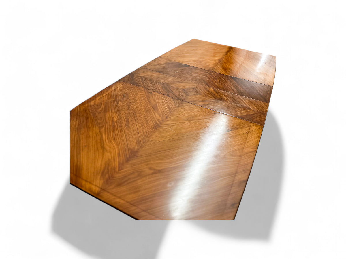 This Brazilian-made extendible dining table crafted from Caviana hardwood embodies the essence of modern Brazilian design. It features minimalist aesthetics with slim legs, characteristic of many contemporary Brazilian furniture pieces. The tabletop is sleek and thin, showcasing the smooth and refined texture of the wood. After being refinished, the wood is in excellent condition, highlighting its natural beauty. This dining table comfortably accommodates about eight people, making it a versatile and stylish addition to any dining space.
