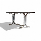 A true showstopper, this table boasts a chrome tubular base paired with a Brazilian rosewood (also known as jacaranda) tabletop. The sleek chrome base infuses the piece with a modern and stylish flair, while the wooden tabletop perfectly complements the overall aesthetic. With ample space to comfortably seat six people, this table is a perfect addition to any decor styles. Embodying all the key aspects of a bold mid-century modern piece, it features clean, angular lines and gracefully swooping curves. The wood has been expertly refinished, while the metal has been thoroughly cleaned, ensuring that the overall piece is in excellent condition.