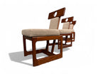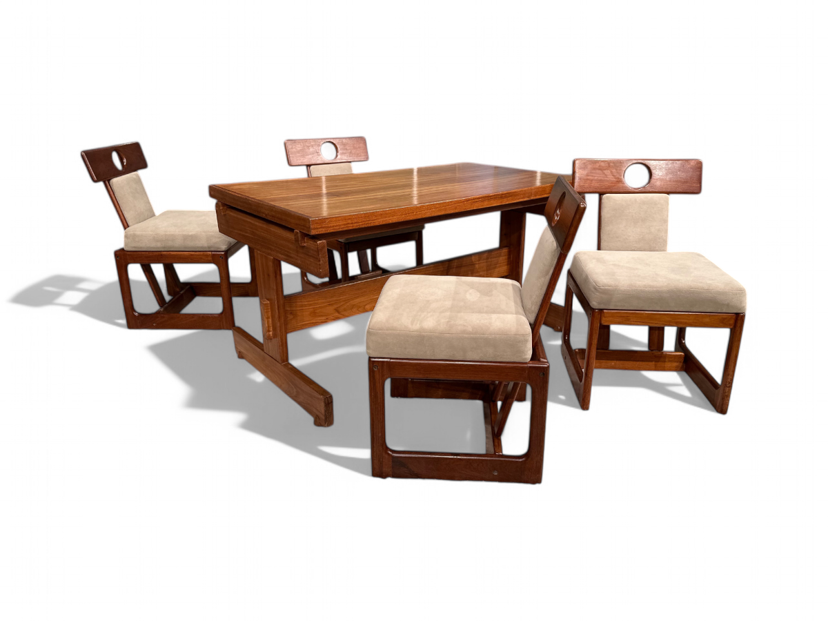 The table and four chairs have been beautifully restored and are in great condition. The chair frames are crafted from Brazilian hardwood, while the seats and backrests feature ultra-suede upholstery. The chairs boast a distinctive design, with a rectangular box-shaped base and a slanted backrest. The accompanying table shares several design elements with the chairs, including circular and straight line motifs. This set is available for purchase as a whole or individually. The listed price is for the entire set.