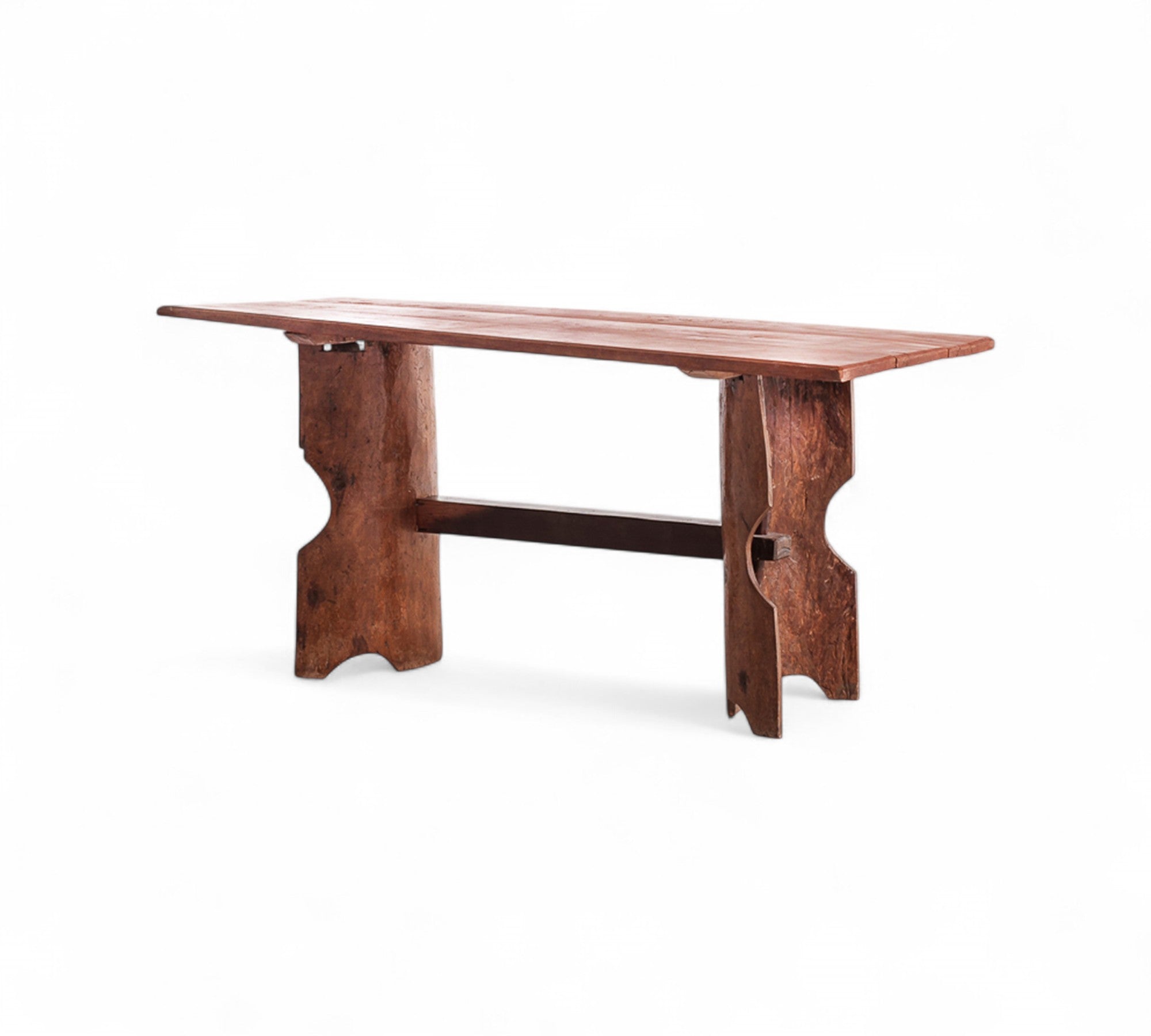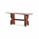 This exquisite dining table, designed by Jose Zanine Caldas in the 1970s, is a testament to true craftsmanship and natural beauty. Made entirely from solid Pequi wood- a species native to Central Brazil renowned for its distinctive features- this table showcases the wood's unique characteristics and extraordinary grain pattern. The meticulously refinished tabletop and legs, formed from split and hollowed-out wood are connected by a wooden plank, underscoring the table's unique construction and pristine condition.