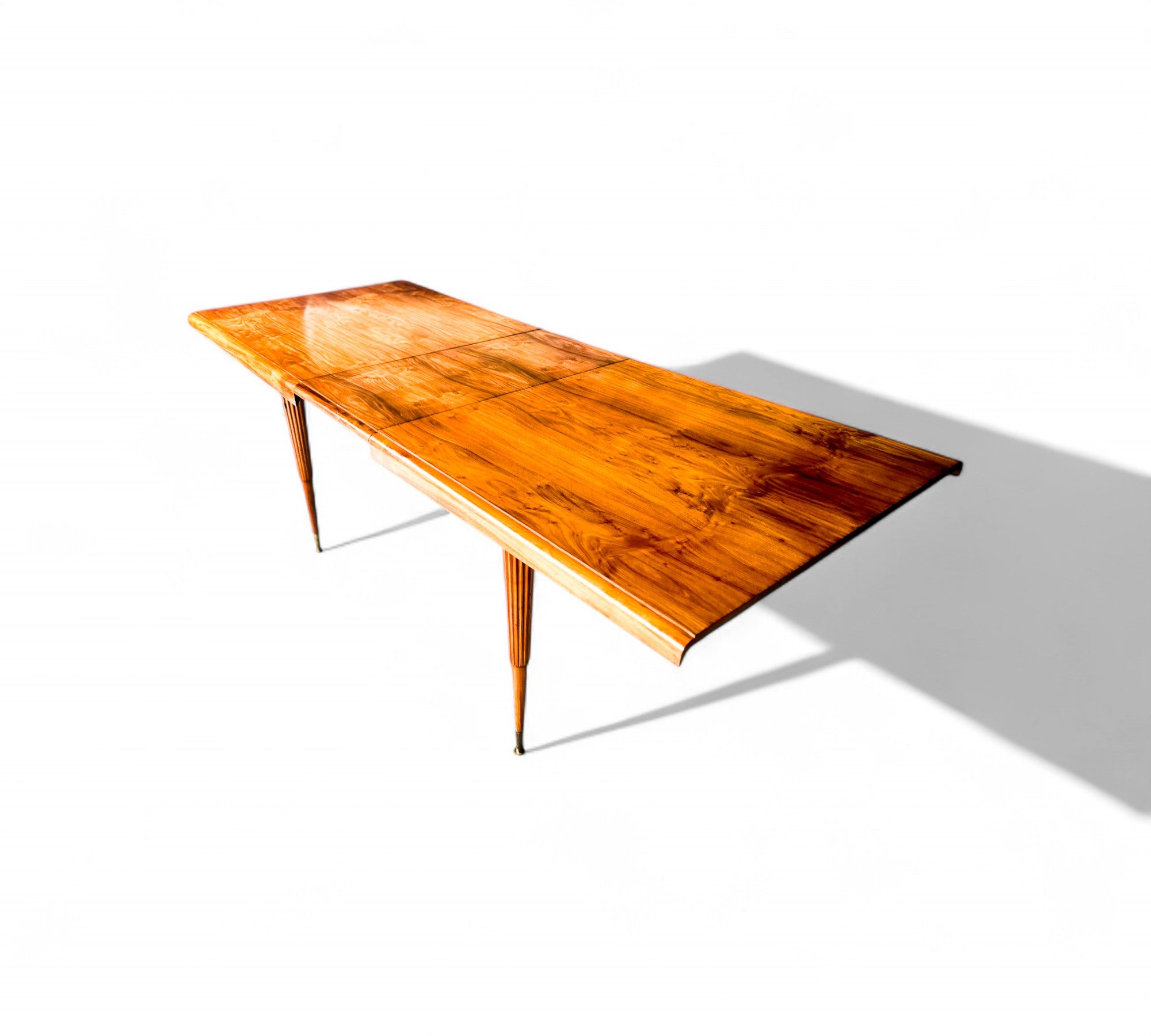 This one of a kind reeded dining table, which comfortably seats eight people was designed by Giuseppe Scapinelli for a private residence in the 1950s. It is made with Caviuna wood and features an extendable top with curved edges and four reeded tapered legs