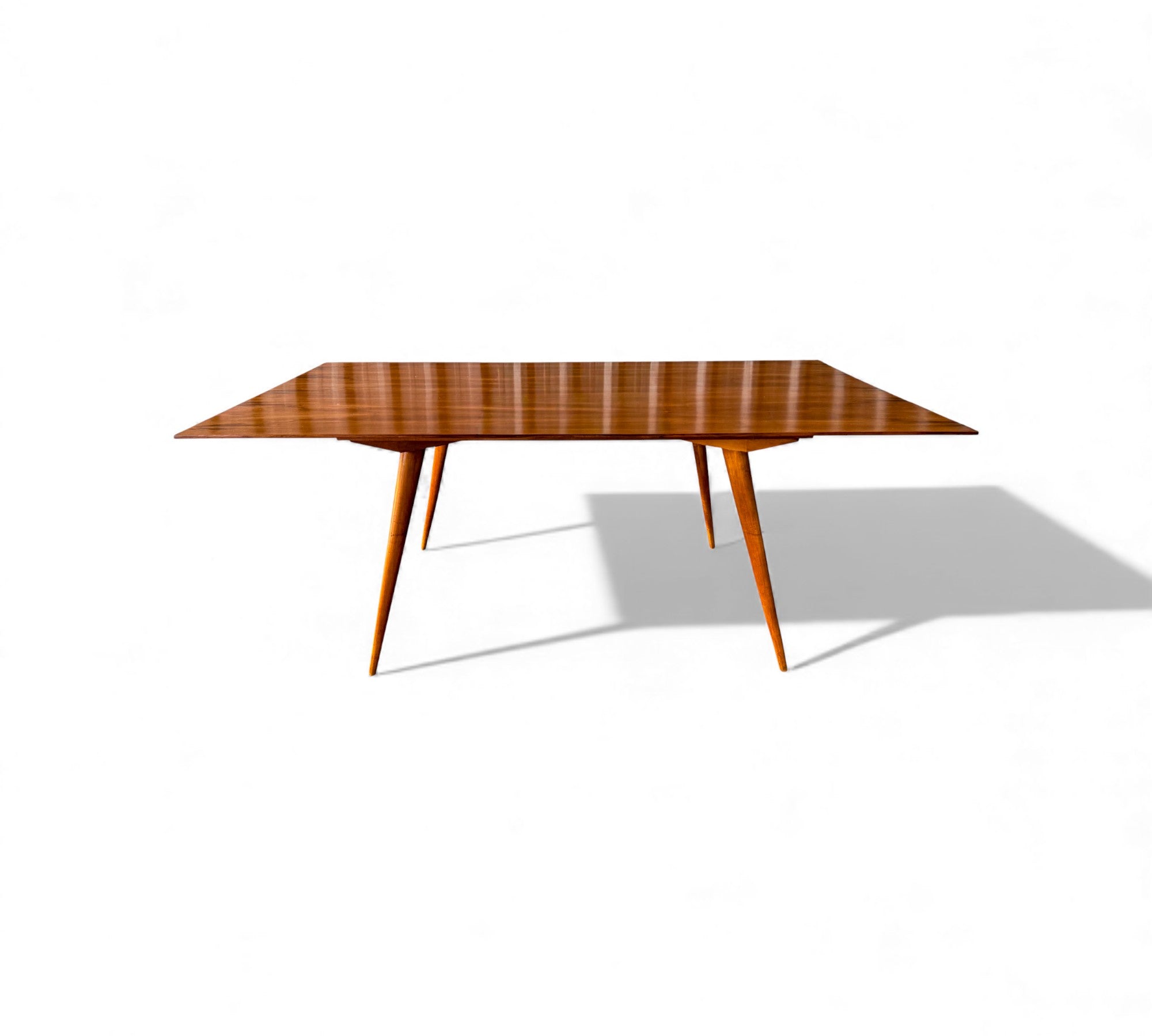 The design features Hauner’s signature lightness and refinement: tapered, splayed legs, a slim, sculptural profile, and a seamless center extension leaf that allows the table to expand for larger gatherings while maintaining its elegant proportions.