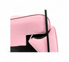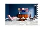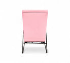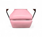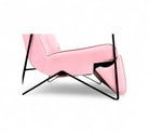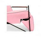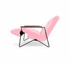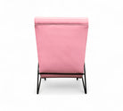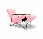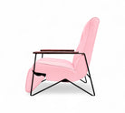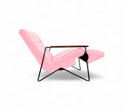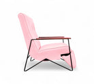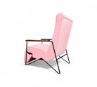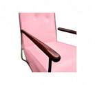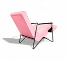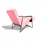 Indulge in unparalleled comfort with this reclining armchair, featuring a robust hardwood structure and luxurious soft pink leather upholstery. Its elegant metal legs complement the Brazilian Rosewood armrests, known as jacaranda, while enabling the chair to recline into two distinct positions.