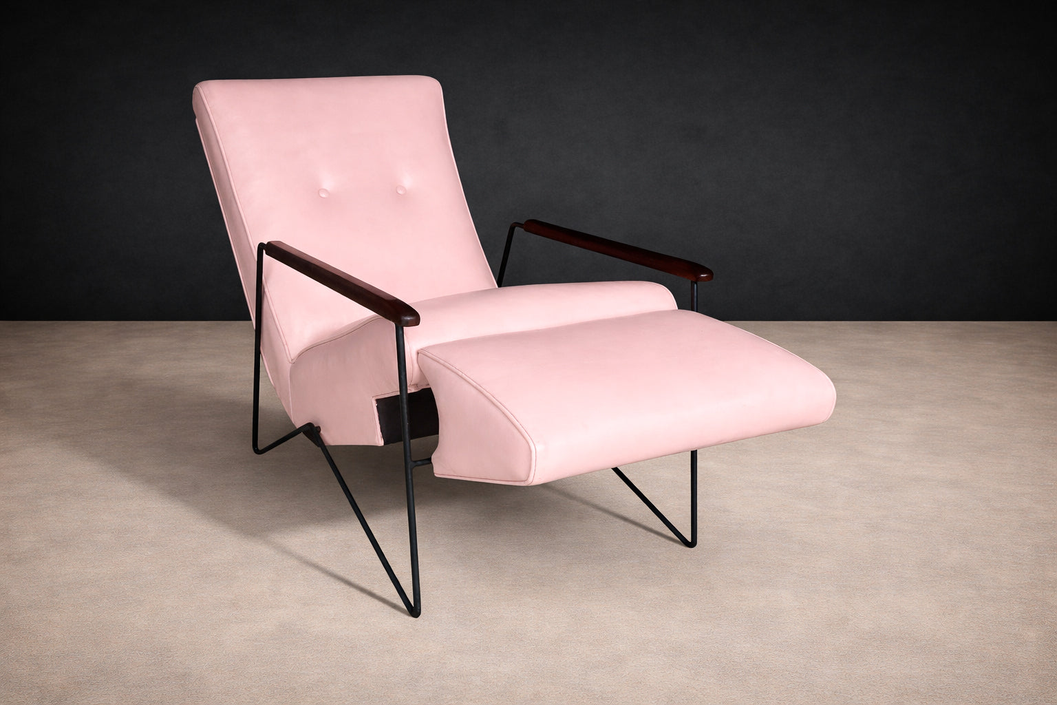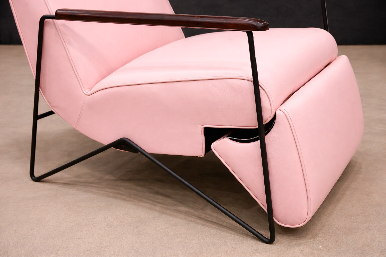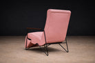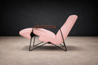 The chair has been carefully restored, with newly upholstered soft pink leather, refinished armrests, and a reinforced reclining mechanism to ensure both comfort and long-term functionality. The leather upholstery remains smooth and supple, while the structure retains its original proportions and design intent. The piece is presented in excellent condition, with only minimal signs of age consistent with its period.
