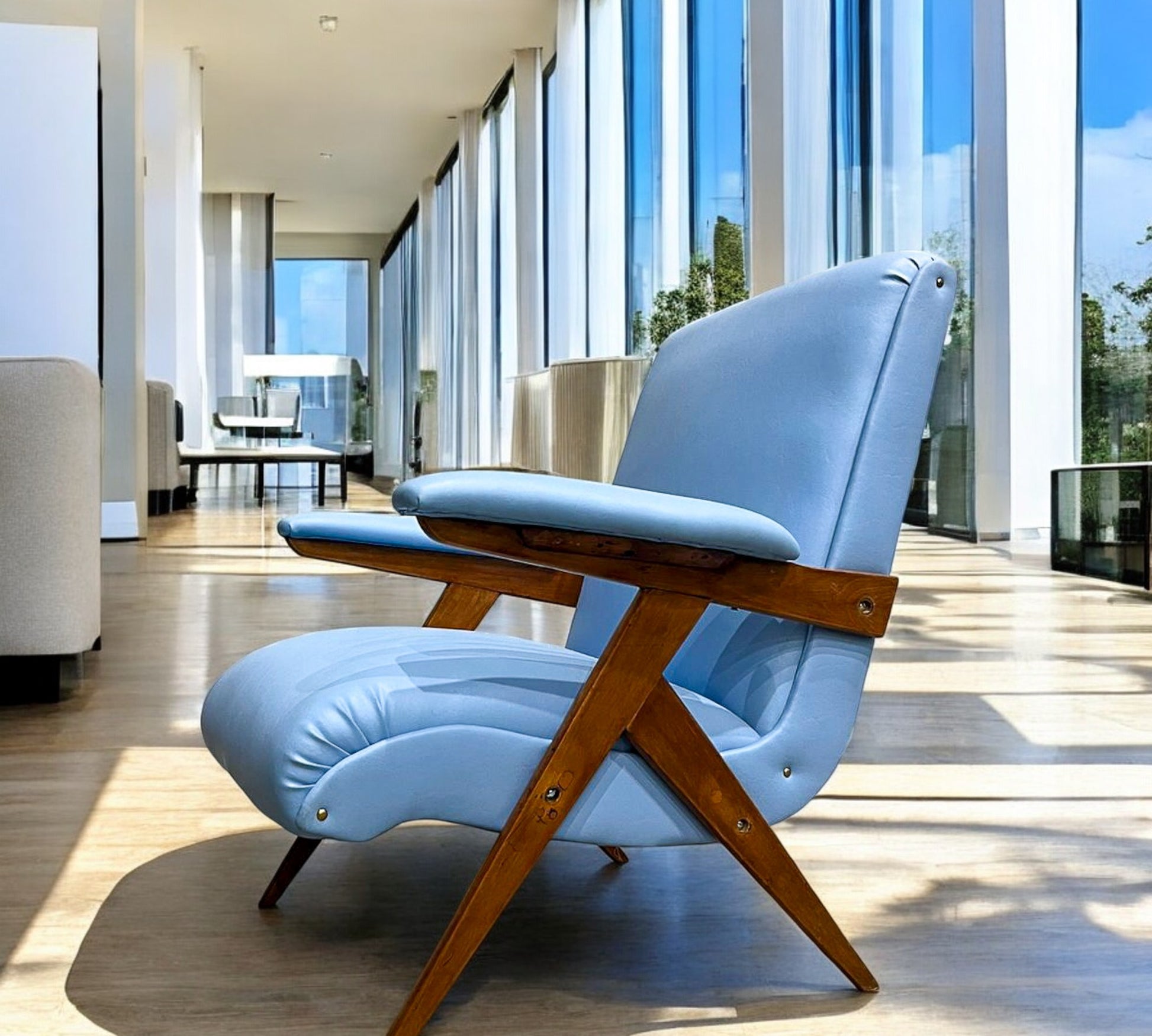 The Z armchair, crafted from solid ivorywood or "Pau marfim" wood, beautifully exemplifies the style of José Zanine Caldas. This model, designed by Caldas for Fabrica de Moveis Artísticos Z, has been meticulously refinished and is in excellent condition. We chose to upholster the piece with a light blue leatherette similar to the original.