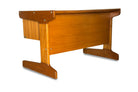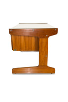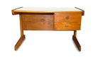 This desk is crafted entirely from cerejera wood and includes two drawers along with a white formica top. The wood has been refinished and, despite some signs of age, remains in excellent condition. Originally owned by Banco do Brasil, the desk bears its manufacturing seal on one side.