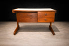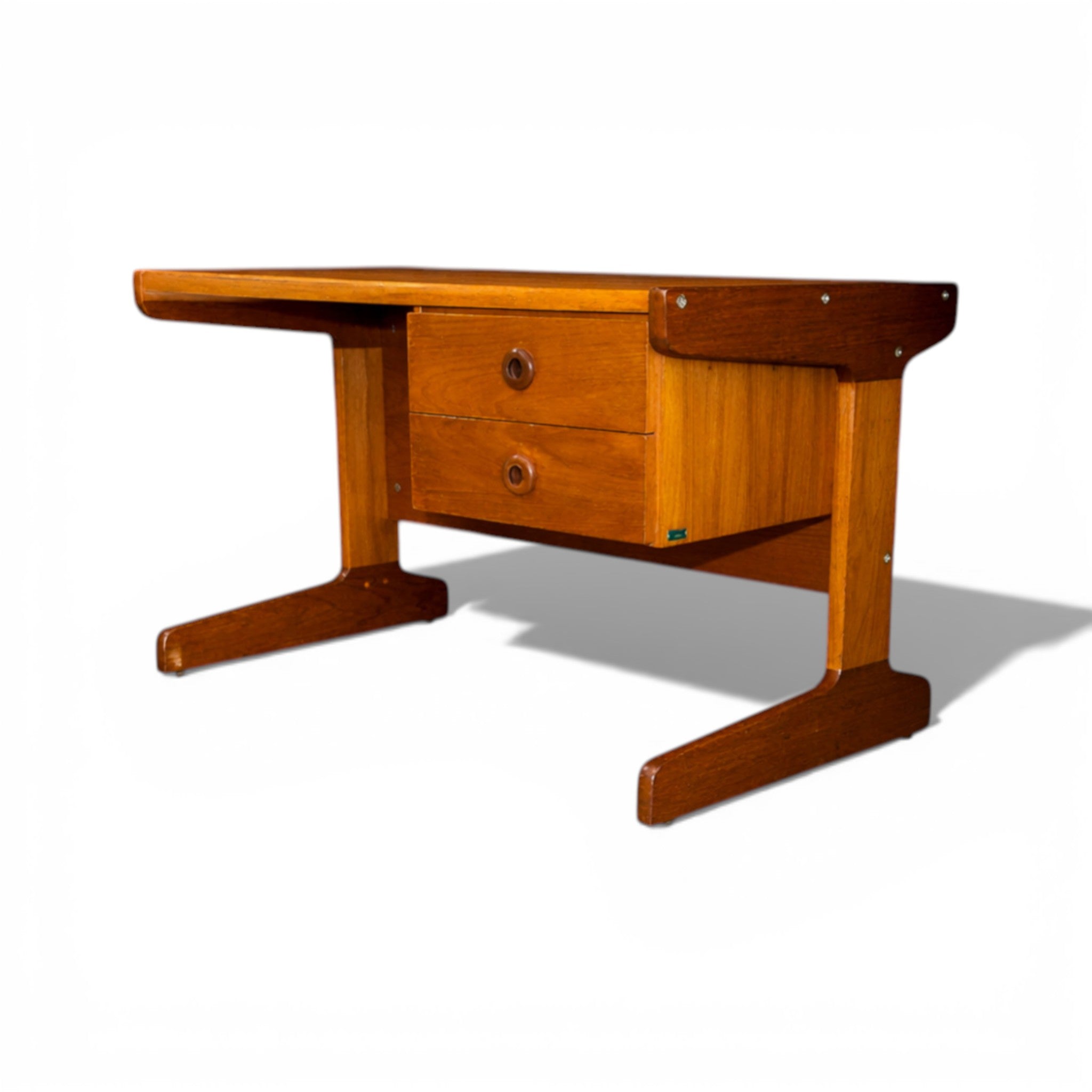 The desk is defined by a balanced, architectural composition. A broad rectangular work surface is supported by two substantial T-shaped end supports, creating a grounded yet visually open structure. Suspended beneath the top, a compact two-drawer cabinet introduces functional storage while maintaining the desk’s overall geometric clarity. The restrained lines and careful proportion exemplify de Barros’ preference for direct structural expression, where each element is both visually legible and functionally purposeful.