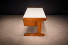 Constructed from cerejeira (Brazilian cherry), the desk highlights the wood’s warm tonal range and subtle grain pattern. The work surface is finished with a white Formica top, providing a durable and practical surface that contrasts with the natural warmth of the wood. This pairing of hardwood structure with laminate work surfaces reflects the period’s embrace of modern materials and industrial practicality.
