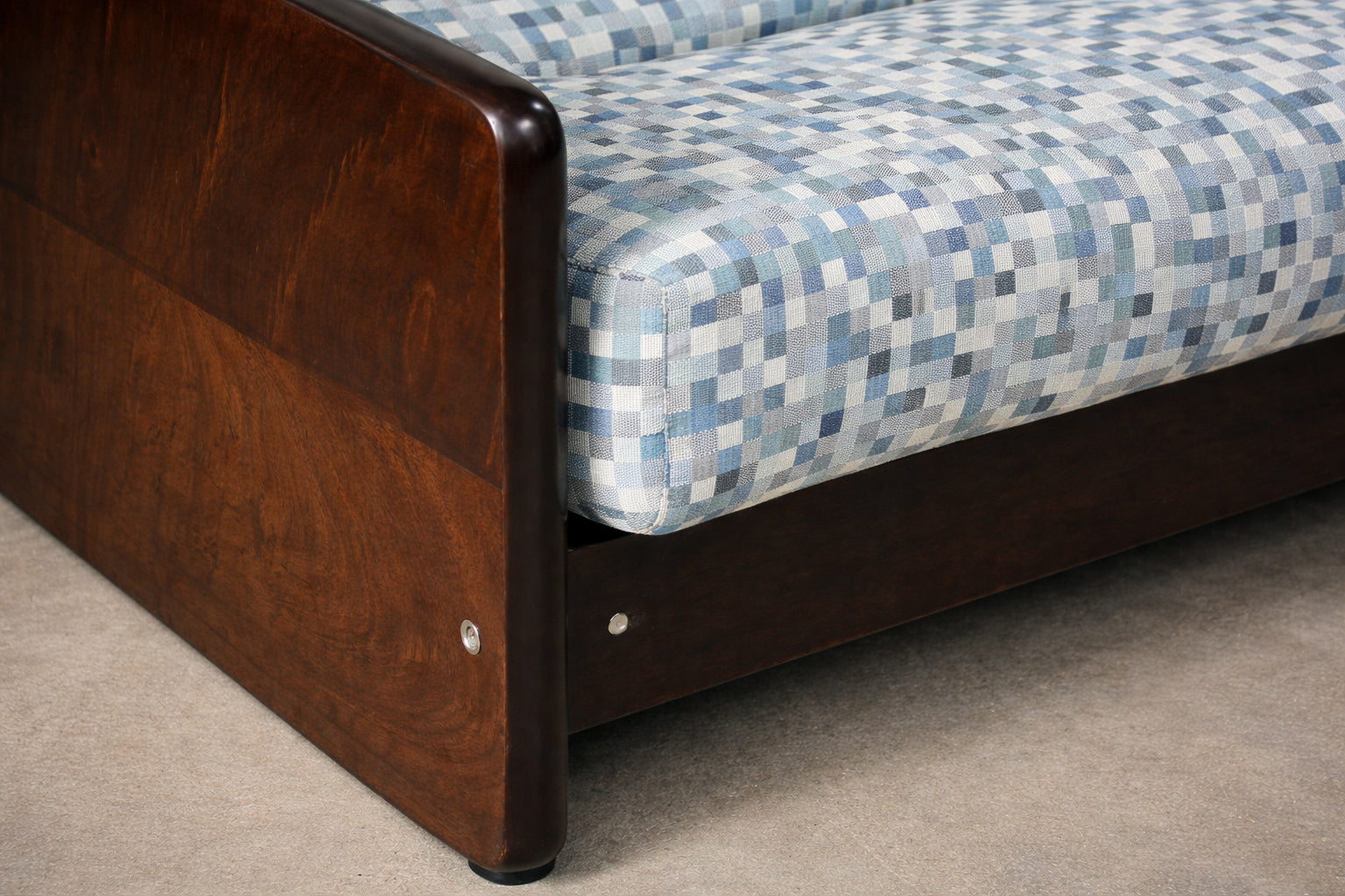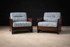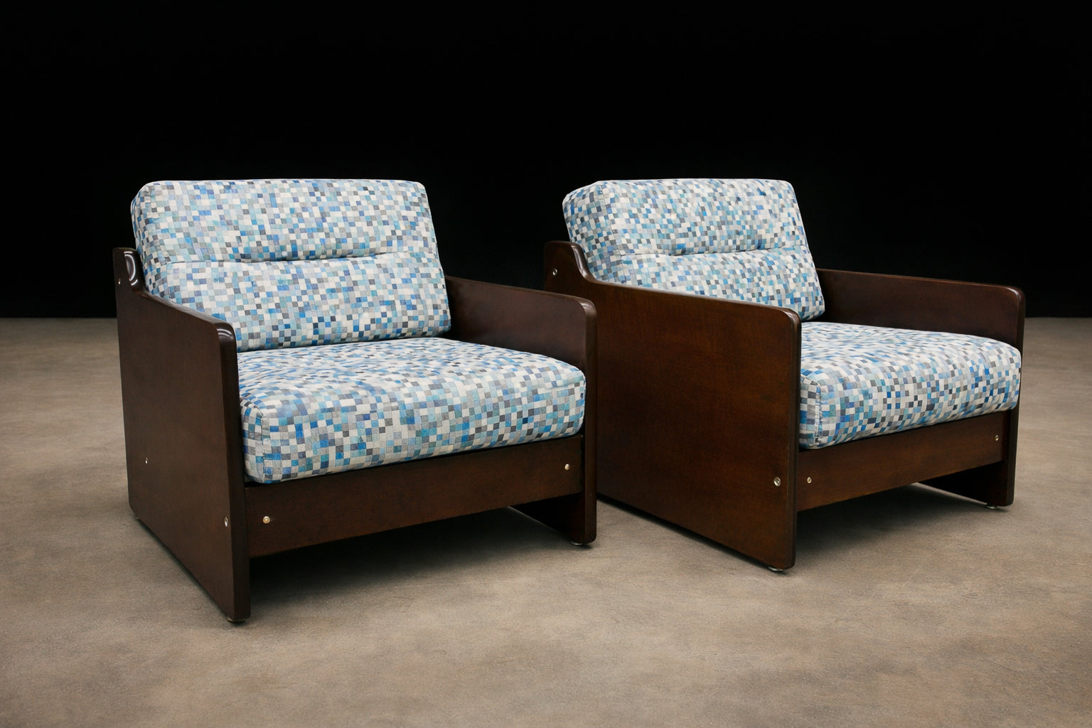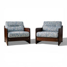 The generously proportioned cushions are upholstered in a lively checkered fabric palette of blue, gray, and white, introducing a subtle graphic rhythm that contrasts elegantly with the warmth of the wood frame. The low, grounded profile enhances comfort and encourages a relaxed seating posture, making the pair equally suitable for residential or curated commercial interiors.