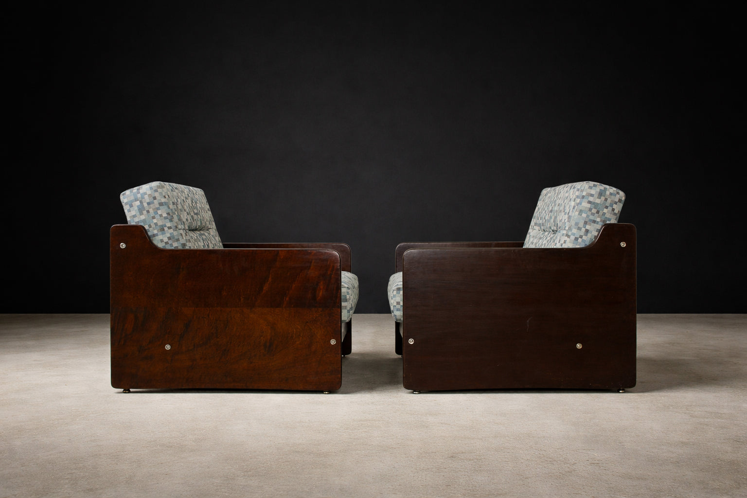 A refined and expressive pair of Brazilian modern armchairs designed by Geraldo de Barros, dating to the 1970s. Executed in Brazilian rosewood veneer, the chairs present a robust yet balanced architectural structure, characteristic of the period’s emphasis on clarity of form and material honesty.