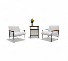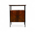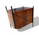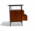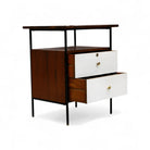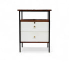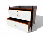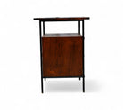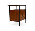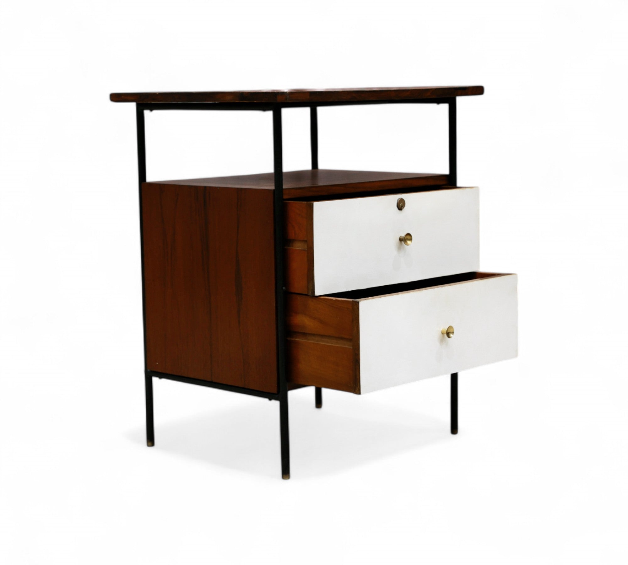 This exceptionally rare side table combines enameled metal, rosewood, and Formica in its construction. The structure is crafted from enameled iron, while the surfaces and sides feature rosewood veneer. The drawer fronts are made from white Formica, complemented by polished brass finishes and handles, adding a touch of elegance to the piece.