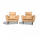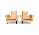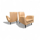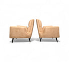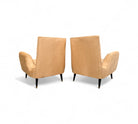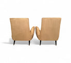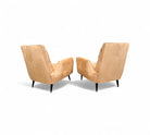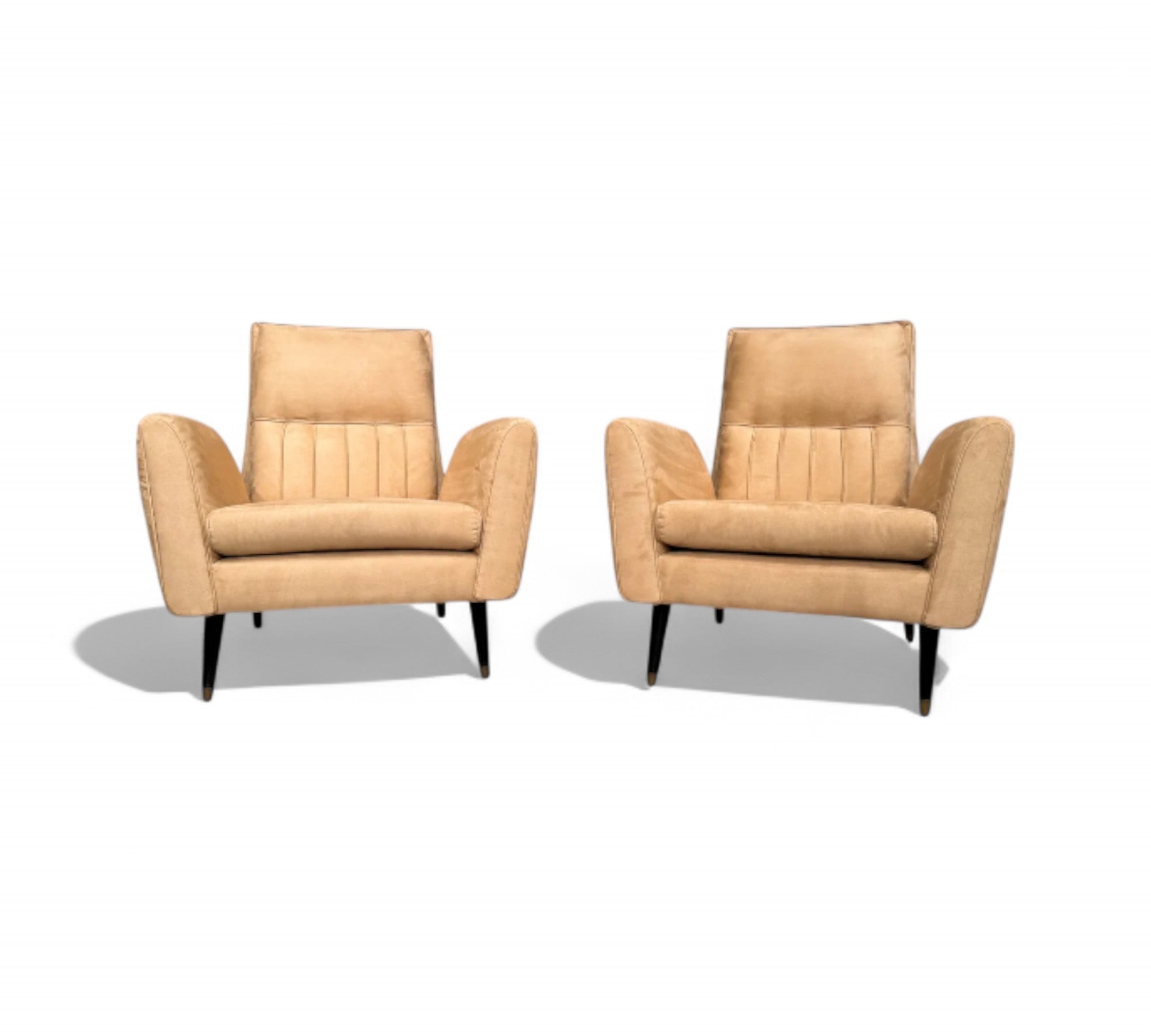 This pair of armchairs designed by Giuseppe Scapinelli for Marguta (his own store) in the 50s feature a hardwood structure with four legs in lacquered tapered legs. The beige suede upholstery is new, soft and super comfortable. The upholstery pattern follows the same as the original one as is shown in the vintage publication showcased. While the manufacturing seal was under the original upholstery, we decided to keep it in a visible place and can be seen under the seat. While the set is a showstopper, the armchairs have a moderate size making them perfect for any kind of environment, from mid century, to modern or contemporary.