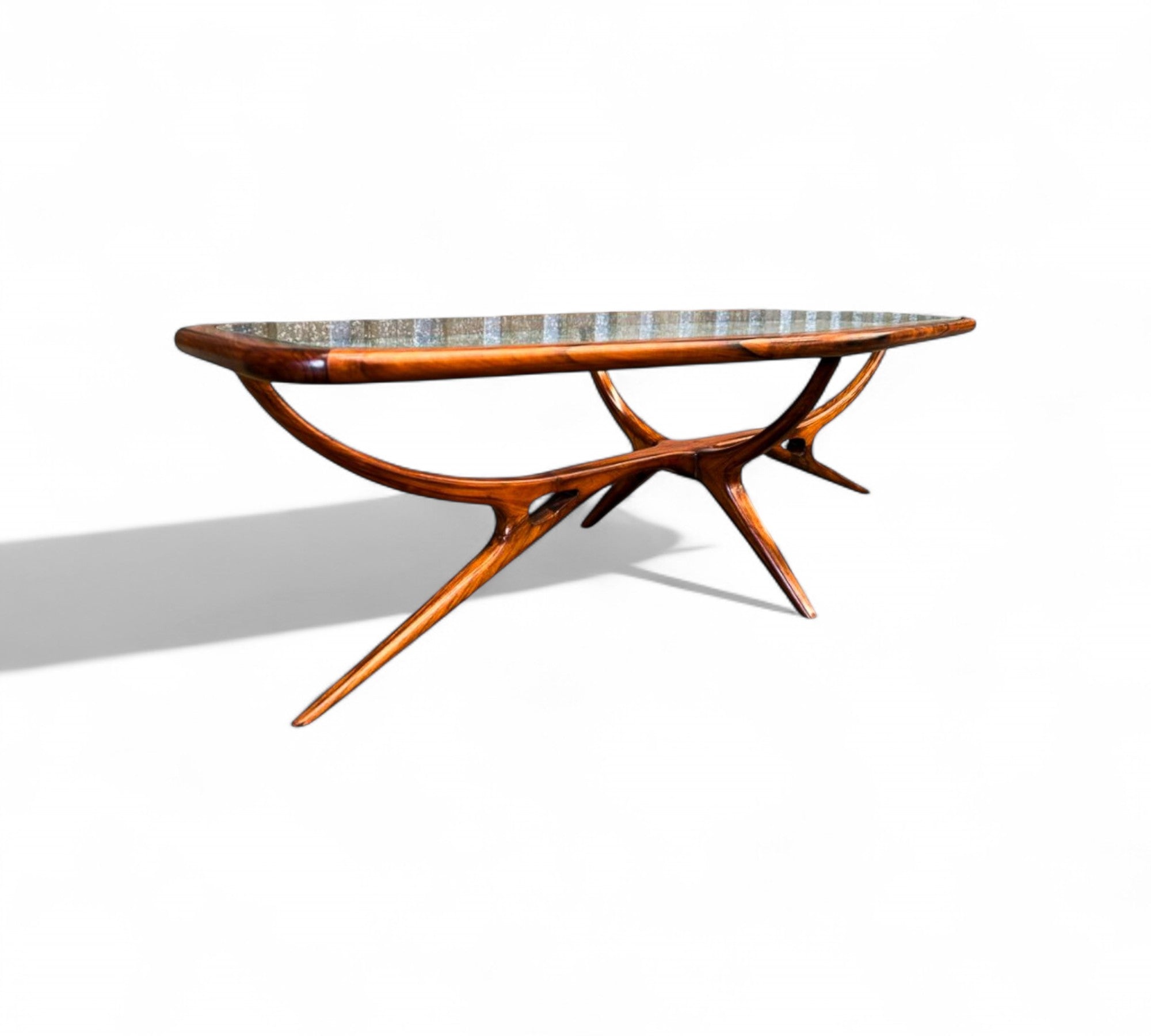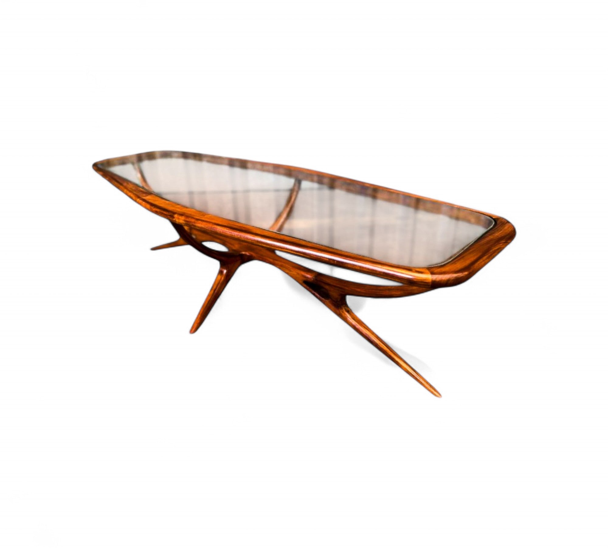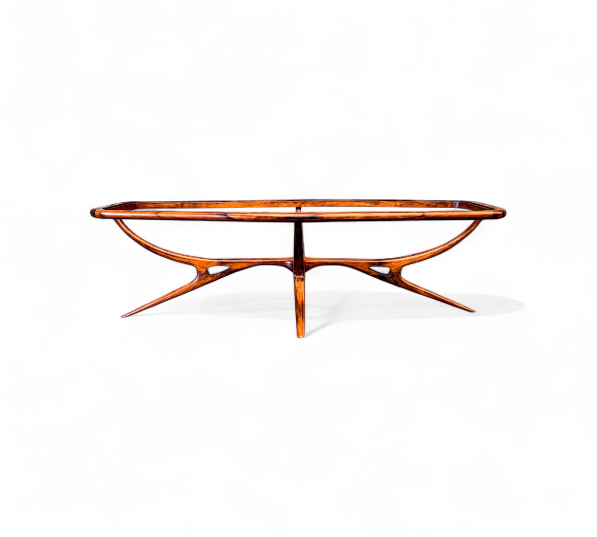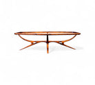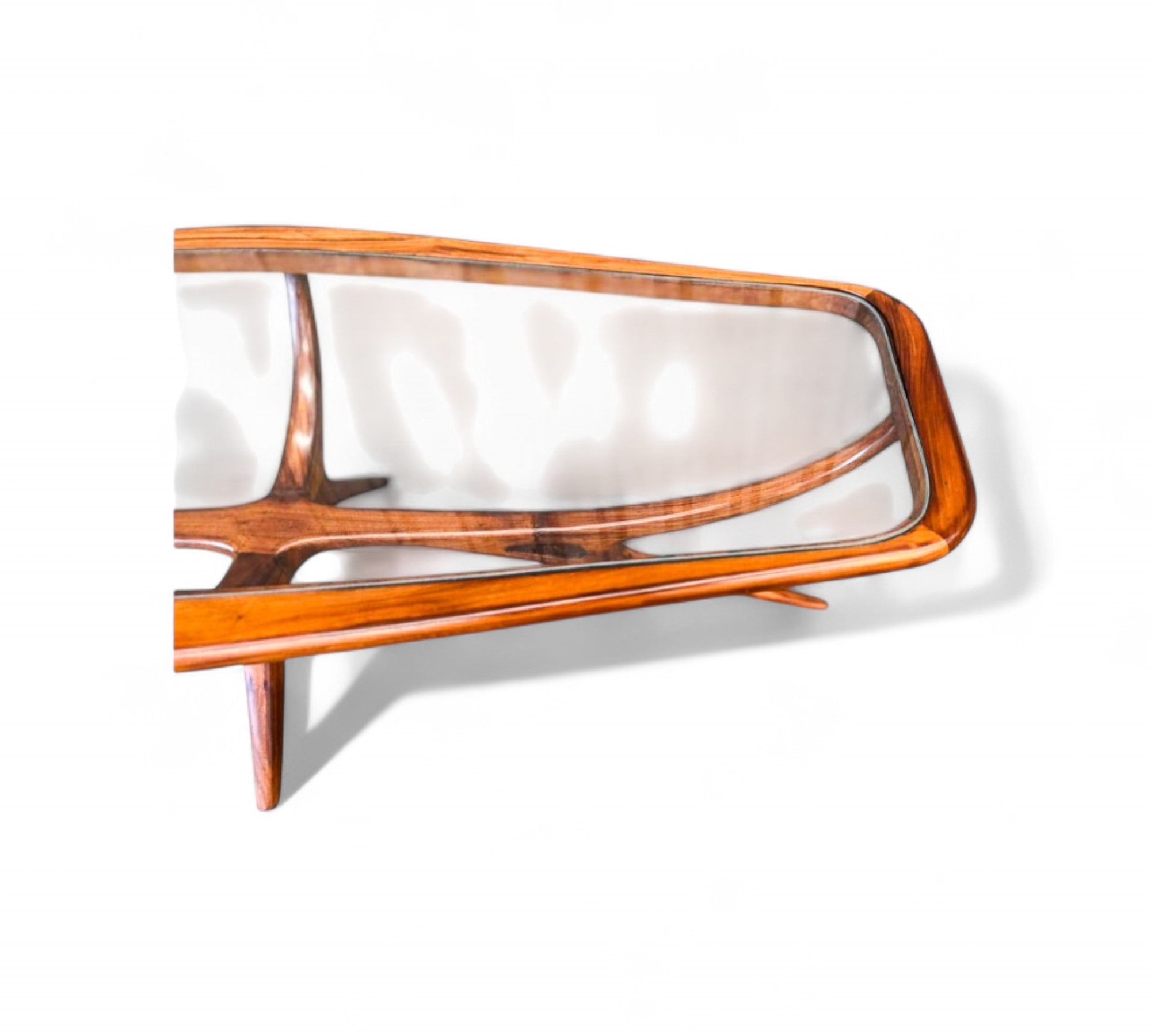 This coffee table has a frame made with Caviuna hardwood and features a glass top with four legs. The table is in the shape of an oval and the wood has a beautiful pattern to it. The shape of the table and style of the legs are what makes this piece so unique and beautiful. In addition, the wood on this piece has been refinished and is in excellent condition. This table can be styled into any type of home and will be a beautiful addition to any living room.