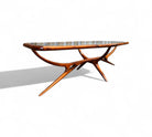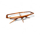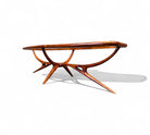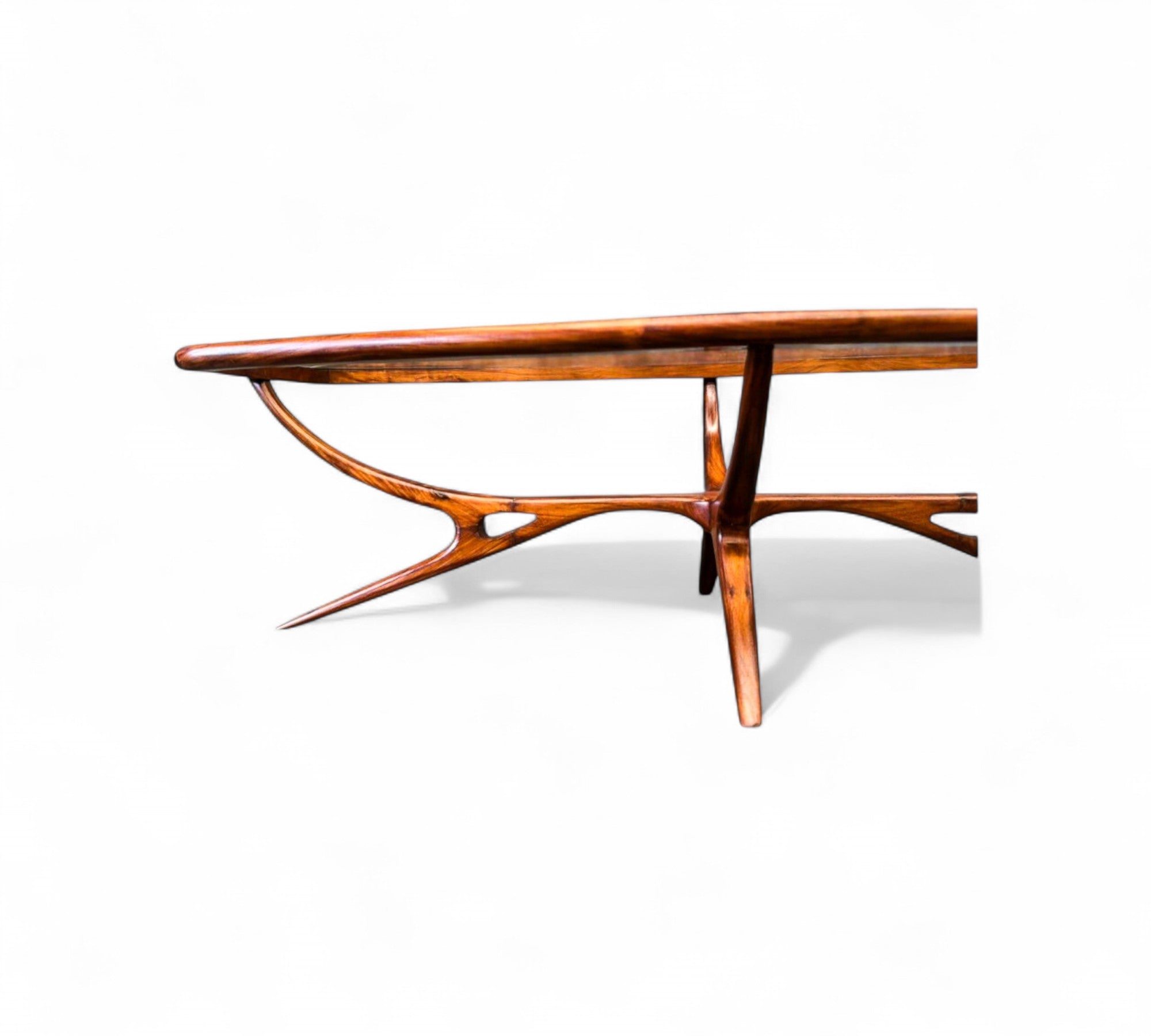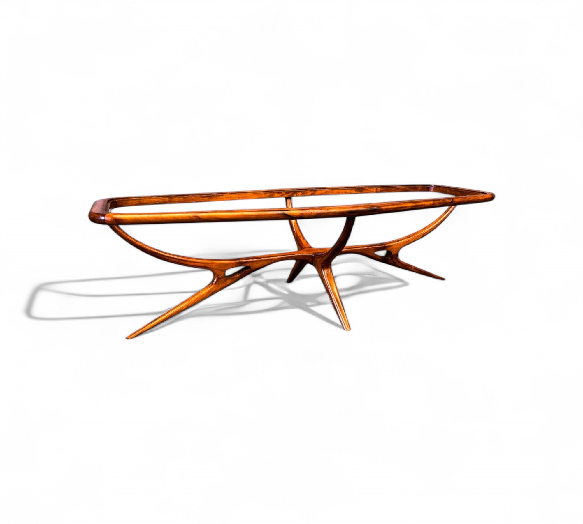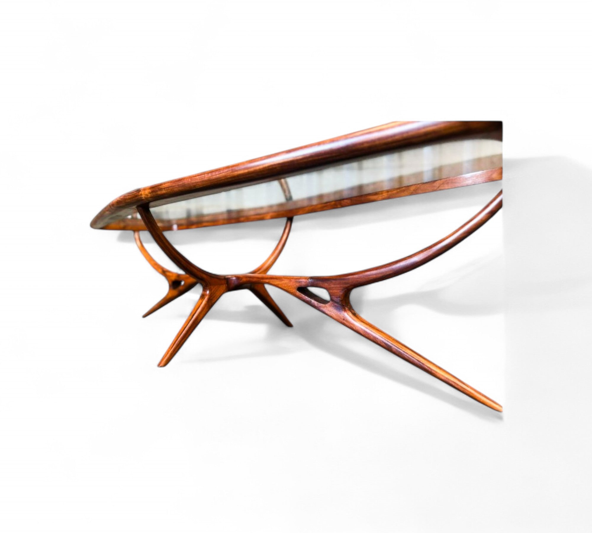 This coffee table has a frame made with Caviuna hardwood and features a glass top with four legs. The table is in the shape of an oval and the wood has a beautiful pattern to it. The shape of the table and style of the legs are what makes this piece so unique and beautiful. In addition, the wood on this piece has been refinished and is in excellent condition. This table can be styled into any type of home and will be a beautiful addition to any living room.