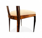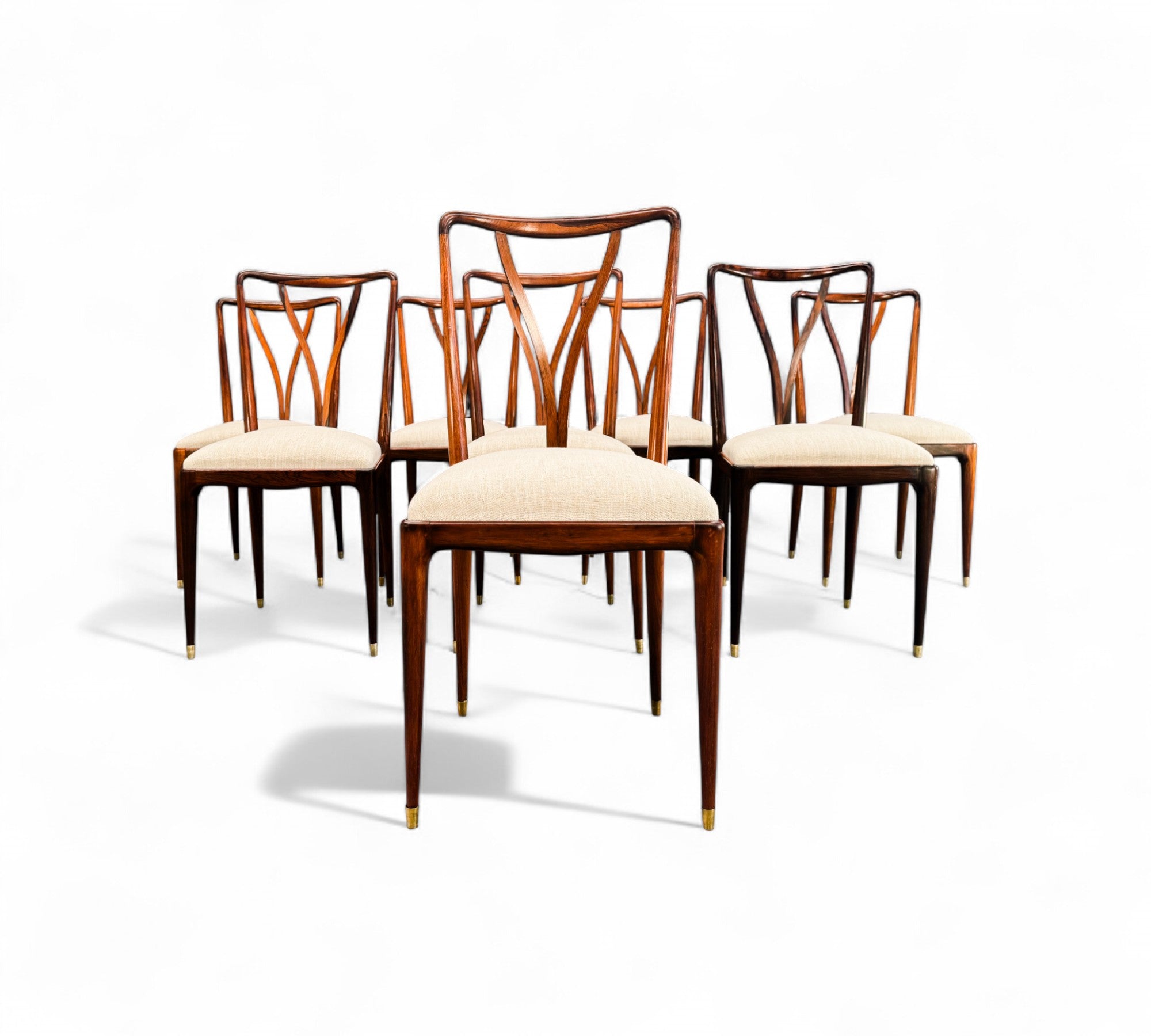Introducing a beautifully sculptural and elegant set of eight dining chairs crafted from the finest rosewood. Each chair features a tall, intricately shaped backrest, along with a well-proportioned seat and four sturdy legs. The rosewood frames have been expertly refinished and are in excellent condition. Originally sourced from a private residence in Brasília, Brazil’s capital, these chairs radiate sophistication and timeless charm. The seats have been reupholstered in a soft, textured linen that complements nicely the elegant shape of each chair.