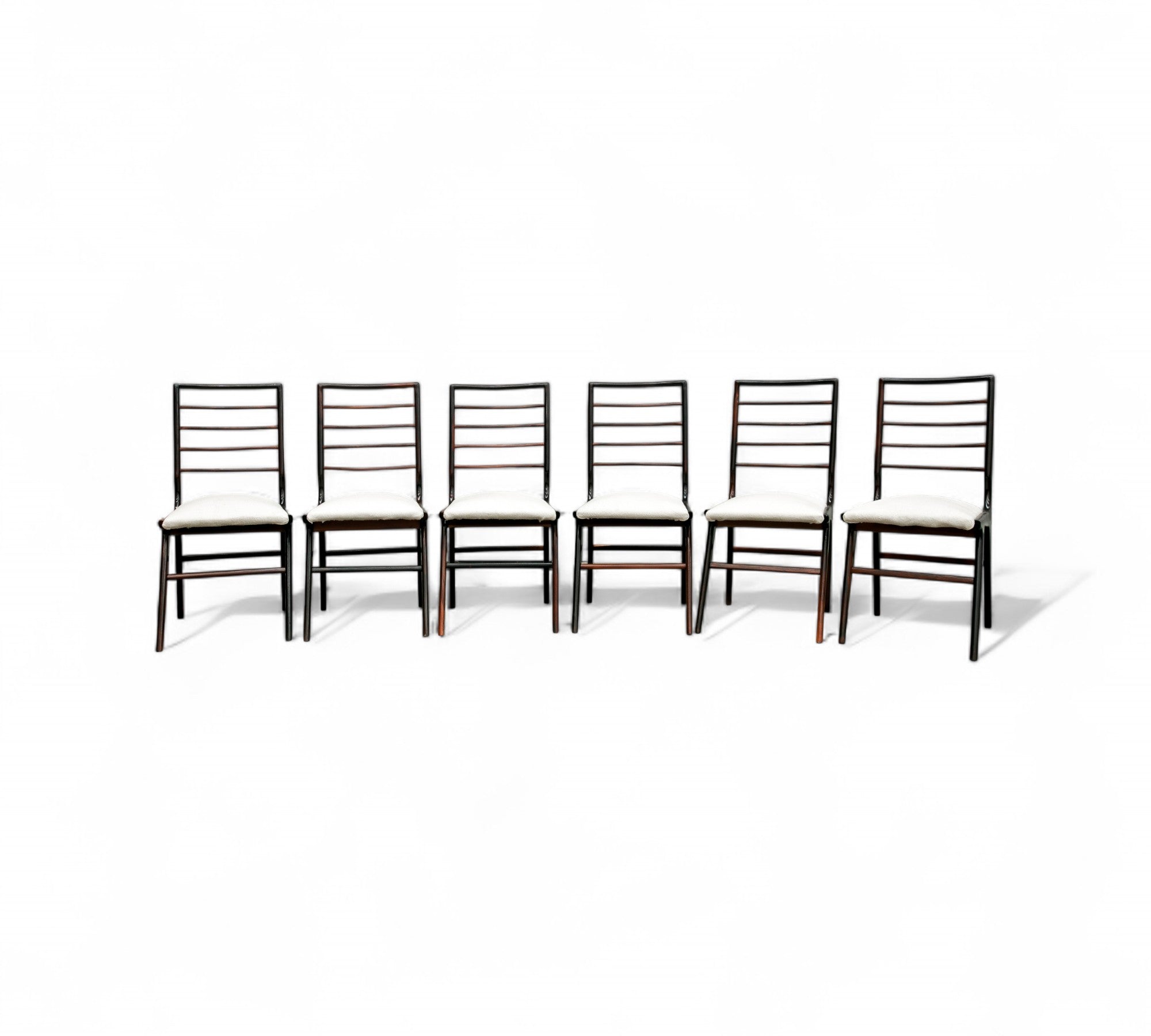 These chairs are made with a rosewood (also known as jacaranda) frame with white fabric seats. The structure of the chair is very slim, which gives it the Brazilian modern style. The seats of the chairs are reupholstered with a white fabric and are very comfortable. Also, the wood has been refinished and the chairs are in excellent condition.