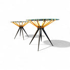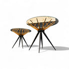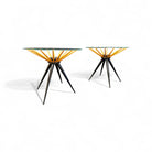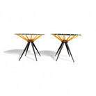This pair of side tables, designed by Giuseppe Scapinelli in the 1950s, crafted from Ivorywood (pau marfim) featuring exquisitely sculpted spider-like legs. These tables exhibit a striking two-tone design with black-painted and natural wood finishes. Each table is topped with a round glass top that accentuates its sculptural form, adding to its appeal in any living space. The legs and top structure are finished in black, while the arms supporting the glass top retain a natural wood tone. Following restoration, the wood showcases its original beauty and remains in excellent condition.