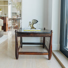 The "Arimelo" side tables feature Brazilian rosewood (jacaranda) veneer and a solid jacaranda frame. The hardwood has been refinished to enhance its wood veins and highlight its age. This piece boasts a beautiful design that adds elegance and warmth to any interior space. It is in excellent condition and was previously owned by a private residence in the Laranjeiras neighborhood of Rio de Janeiro.