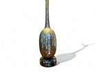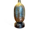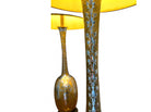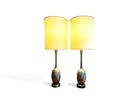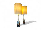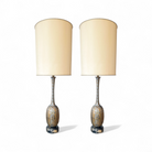 Sculptural Art Nouveau table lamps with marble bases and curved brass bottle-shaped bodies. Intricate design inspired by Middle Eastern motifs and superb metalwork. Fully functional hardware, original shades in excellent condition. Height: 45 inches; shades are 19 inches tall with a 16-inch diameter.