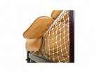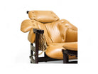The "Jangada" armchair is named after the rustic fishing boats used by fishermen along Brazil's northern coast. Its "purplish" wooden frame beautifully contrasts with the iconic caramel leather upholstery, enhancing its luxurious and elegant appearance. The upholstery, crafted over three months by some of Rio de Janeiro's finest upholsterers, follows Gillon’s methodology, as shown in the attached vintage publications. Remnants of the manufacturing seal are visible on the wood base, and the nets are new.