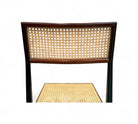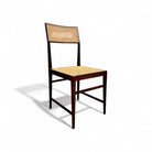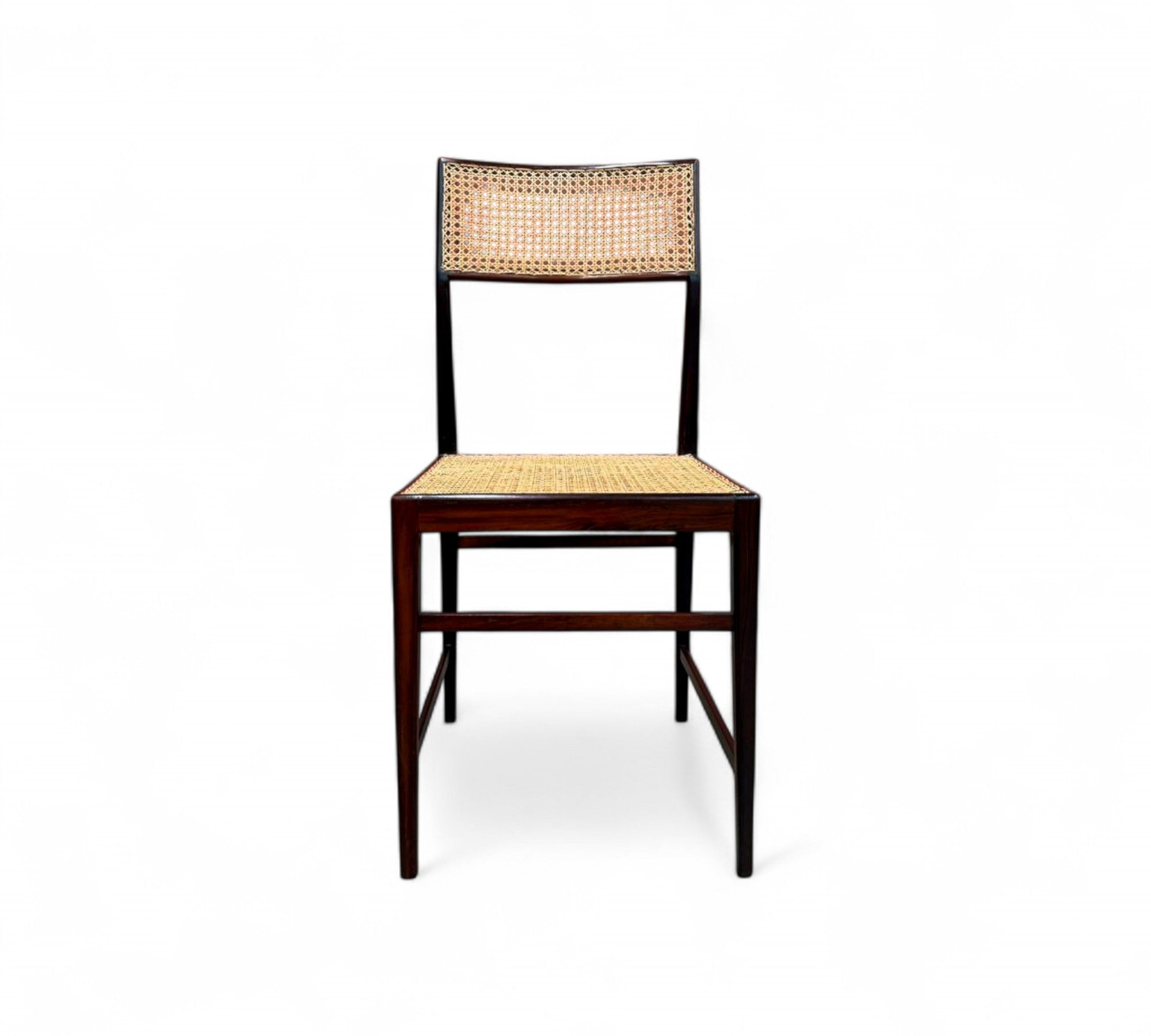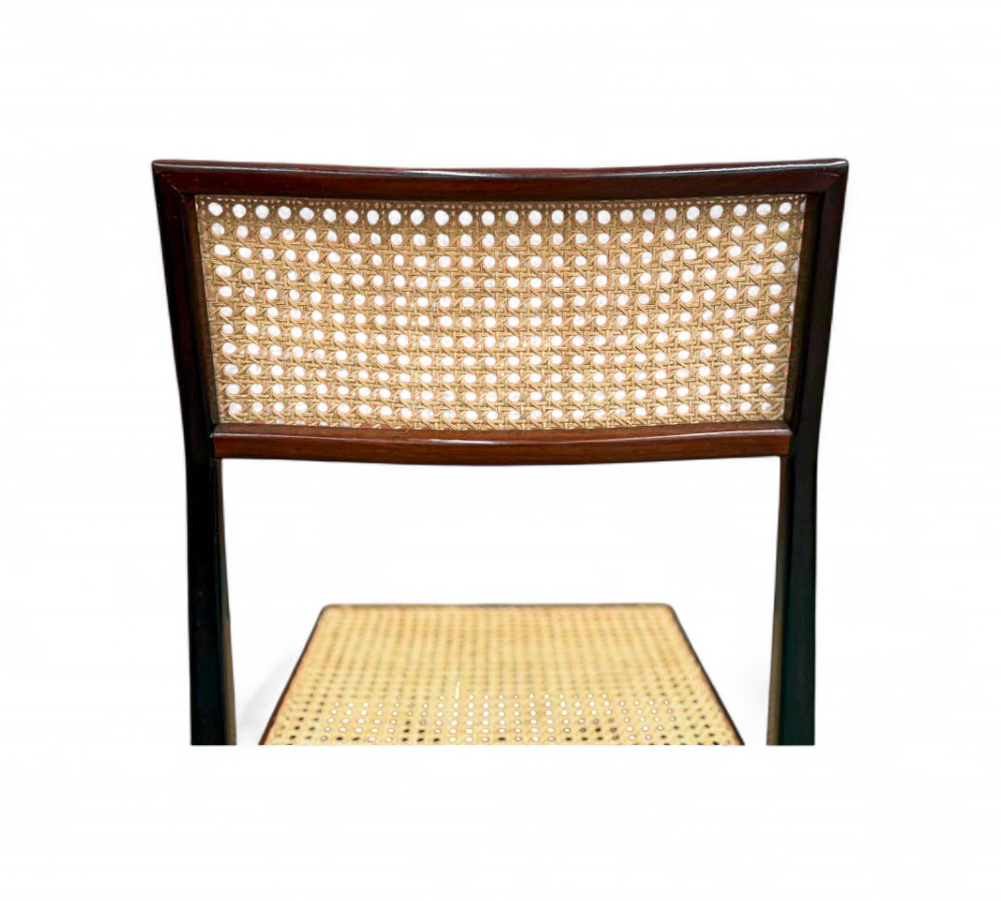 Both the seat and backrest feature handwoven cane, adding texture, breathability, and a warm natural contrast to the dark, sculptural wood. The chair’s slender proportions, tapered legs, and open silhouette highlight Tenreiro’s philosophy of creating furniture that felt visually “light”