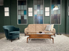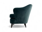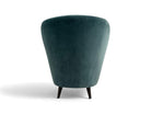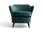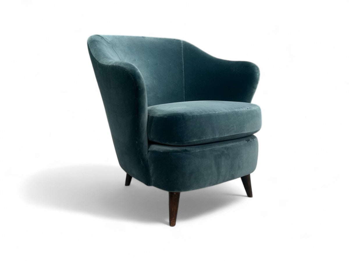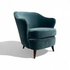 This model, called "Concha" (which means "Shell" in Portuguese) and designed by Joaquim Tenreiro, features a hardwood frame upholstered in teal mohair. Four slender, toothpick-like legs support the armchairs. The backrest, resembling a shell, is elegantly curved and smoothly extends into the armrests.
