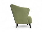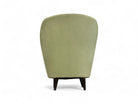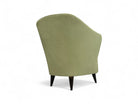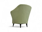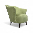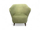 This armchair, attributed to Joaquim Tenreiro, features a hardwood structure with four pointed legs and upholstery in super-smooth, comfortable light green Ultrasuede. The model is named "Concha," which translates to "Shell" in Portuguese. This armchair, attributed to Joaquim Tenreiro, is crafted from hardwood with four pointed legs and is upholstered in super-smooth, comfortable light green Ultrasuede. The back of the chair, resembling a shell, curves gracefully into the armrests.
