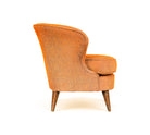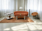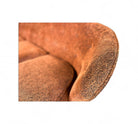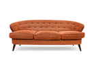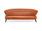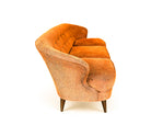 Named "Concha," Portuguese for "shell," this sofa embodies the iconic design of Joaquim Tenreiro. Crafted with a sturdy hardwood structure, it features upholstered seats in ochre fabric and rests gracefully on four toothpick legs. The sofa's distinctive appeal lies in its sleek lines, characterized by rounded curves that flow seamlessly from the back to the armrests.