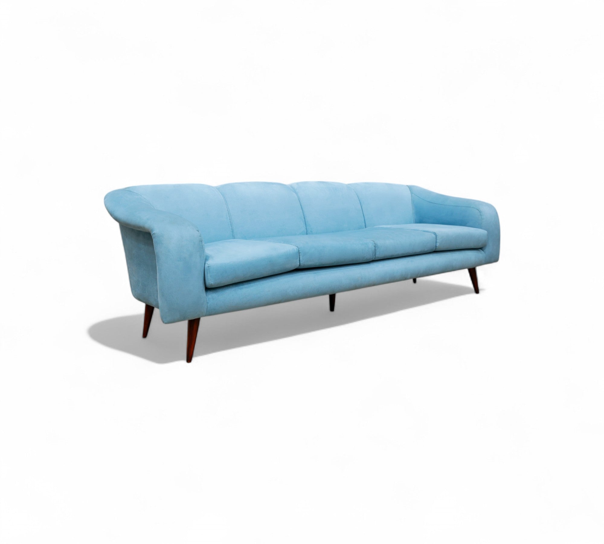 Joaquim Tenreiro designed this "Curva" sofa in the 1950s for his own company, Tenreiro Moveis e Decorações. It comfortably seats four people and features an original shell-like hardwood structure with legs painted black. The upholstery in brand new light blue ultra suede adds a modern touch to this iconic design by Tenreiro. Vintage publications showcasing the piece are included.
