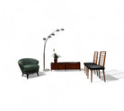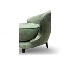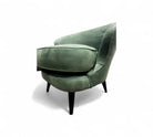 The model, known as "Concha" (shell in Portuguese), features a hardwood structure upholstered in green suede and supported by four toothpick legs. The curved backrest, resembling a shell, seamlessly transitions into the armrests. These armchairs are particularly special due to their beautiful design, iconic of Joaquim Tenreiro's craftsmanship.