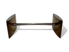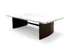 This coffee table features a wooden structure crafted from Brazilian Rosewood, also known as Jacaranda, and consists of two oval legs connected by a central wooden beam. The tabletop is made of elegant white marble, adding a touch of sophistication to the design. The wood has been meticulously refinished, ensuring the table is in excellent condition.