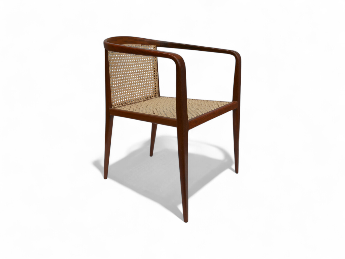 This chair is crafted from Caviuna wood, and features four slender toothpick legs, a backrest with straw caning, and delicately curved armrests that connect to the backrest. The wood has been refinished and repainted, bringing it to excellent condition. Designed in the early fifties, when Brazilian production was still very artisanal and limited in batch sizes, there are only a few of these chairs in existence. This model is one of John Graz's most renowned designs, despite his limited output as a furniture designer. The organic shape of the structure creates a visual illusion of lightness, even though the armchair is quite sturdy. This piece is truly a masterpiece of design.