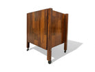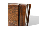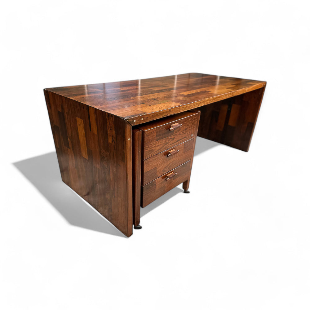 This desk with a file cabinet, designed by Jorge Zalszupin and produced by his company L’Atelier in the 1960s, highlights an innovative approach to Brazilian rosewood in a patchwork style. This technique, which involves a collage of rosewood pieces in various shades, showcases Zalszupin's dedication to both creativity and efficiency by effectively using leftover wood scraps from the factory.