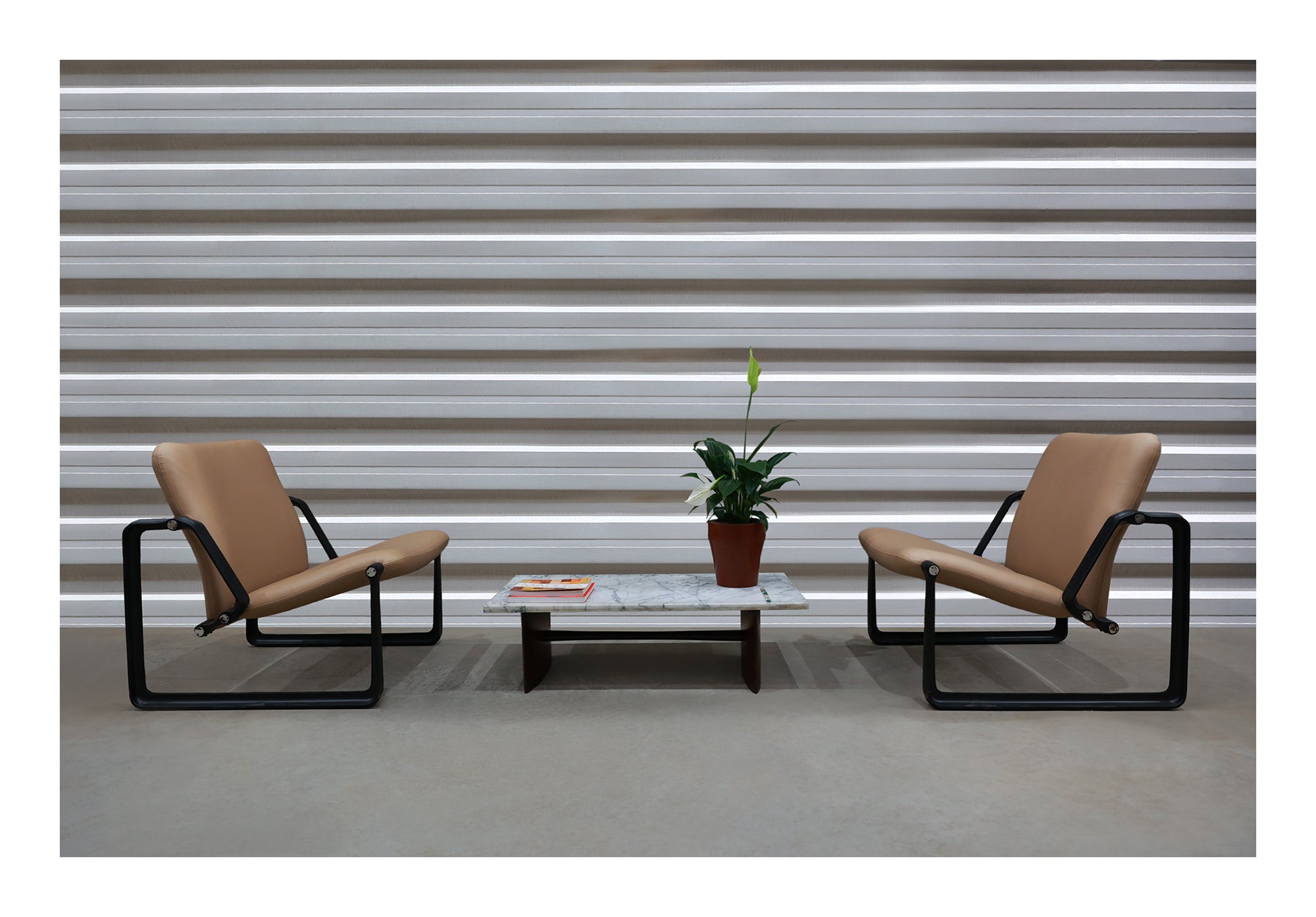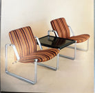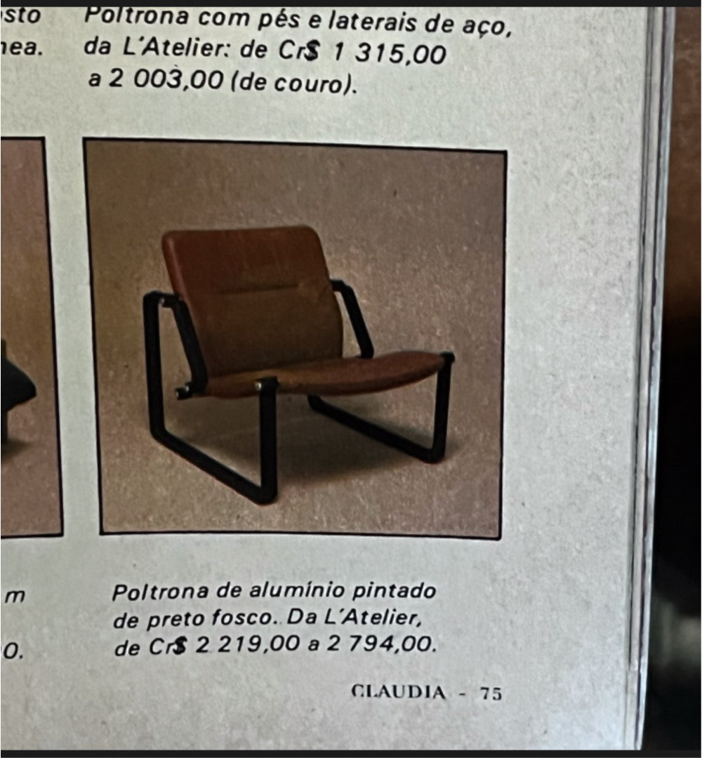 Designed to meet the rising demand for office furniture in Brazil during the early 1970s, these armchairs feature a robust metal frame and recently redone upholstery. As shown in the original manufacturer’s manuals and product catalogs from that era, this set originally graced the Sudameris Bank in Rio de Janeiro, still bearing the institution’s heritage plaque.