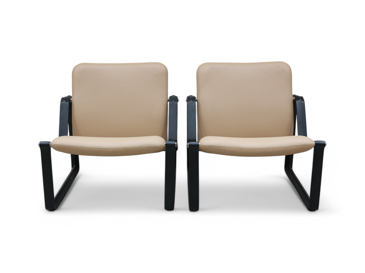Perfect for mid-century modern, contemporary, or modern interiors, these armchairs are in pristine condition offering refurbished metal frames and newly reupholstered seats.