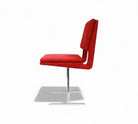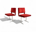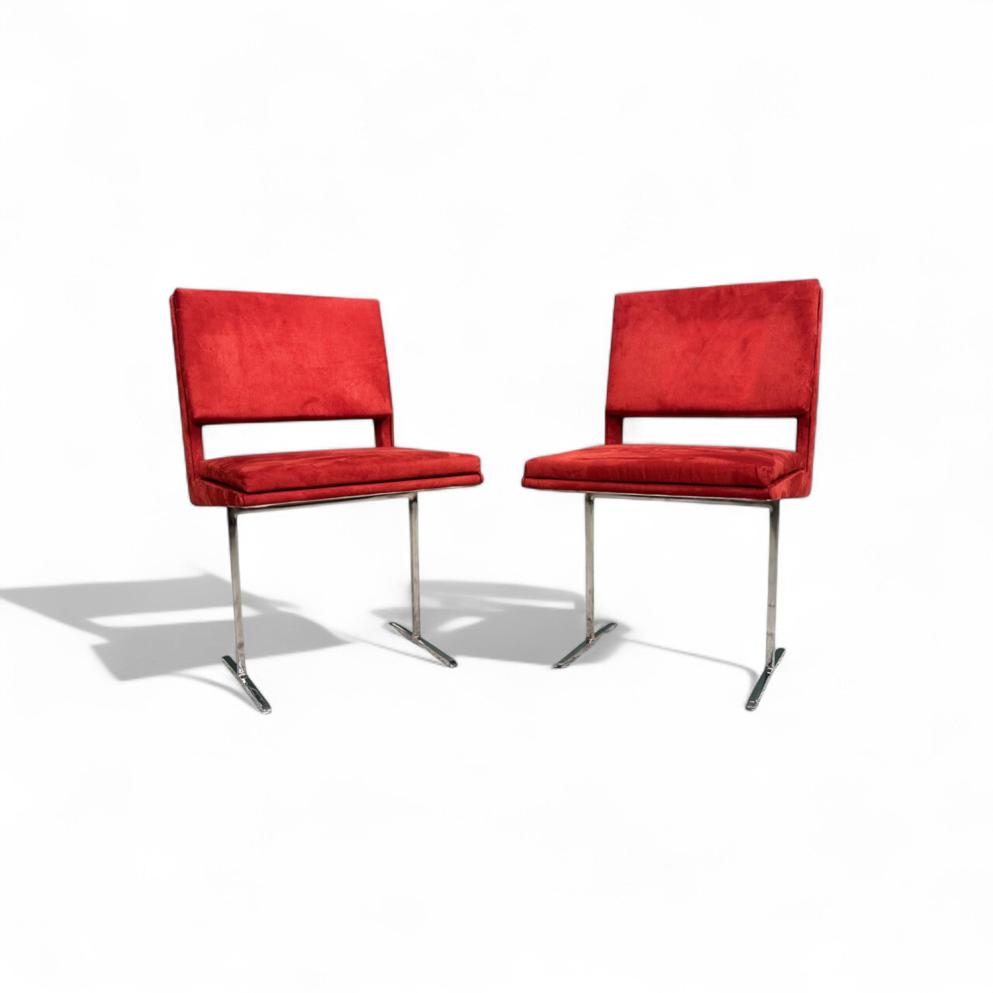 This set of two chairs, designed by Jorge Zalszupin, features a chrome frame complemented by vibrant red suede upholstery. The chairs showcase a sleek and modern design, evident in their contoured seats and slender legs. Recently reupholstered, they are now in excellent condition, ready to enhance any space with their timeless elegance and contemporary appeal.